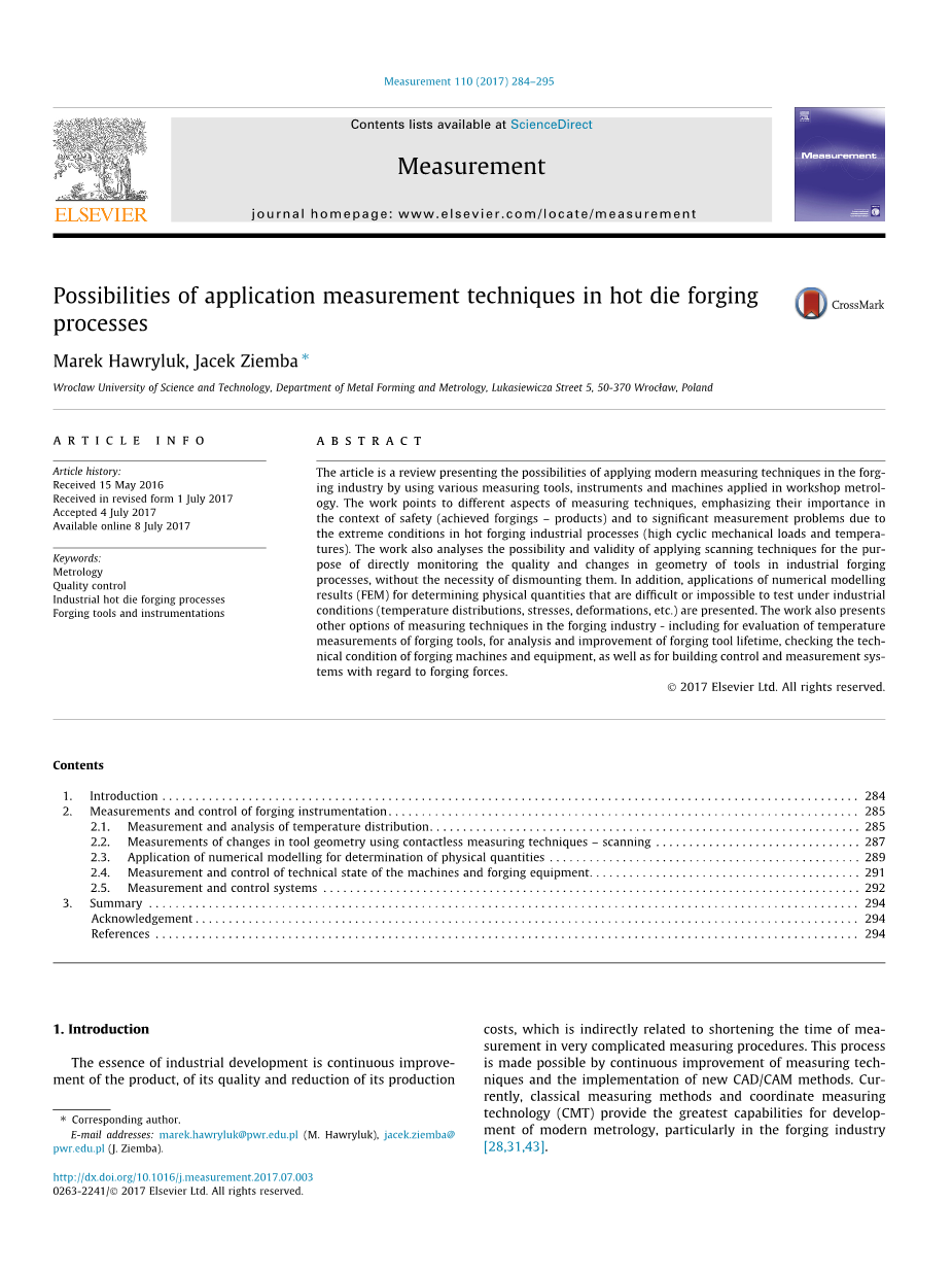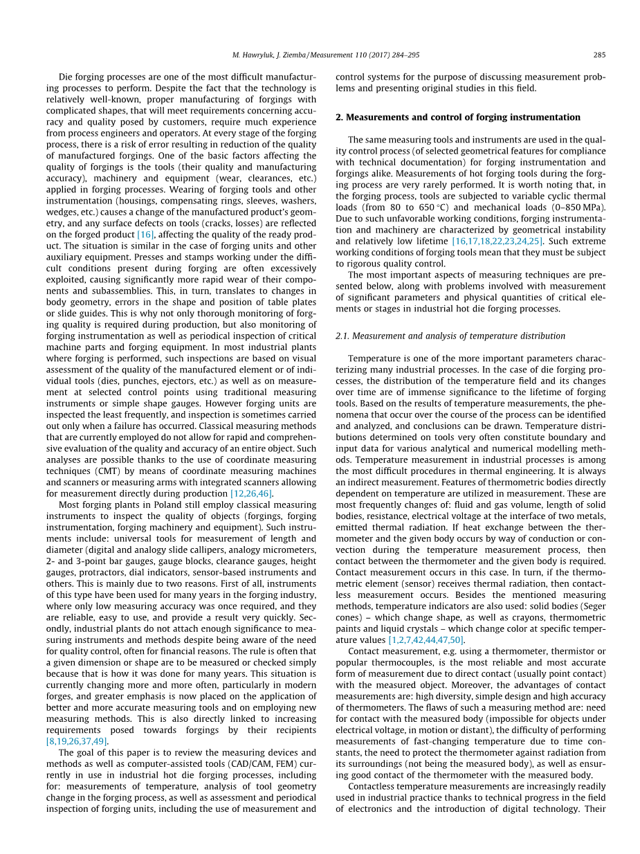 本文是一篇综述性论文,通过使用车间计量过程中使用的各种测量工具、仪器和机器,展示了将现代测量技术应用于锻造行业的可能性。这篇文章讨论了测量技术的不同方面,强调测量技术在安全(从锻件 - 产品)方面的重要性,以及由于热锻工业过程中的极端条件(循环的高强度机械负载和高温)而导致的重大测量问题。该论文还分析了应用扫描技术直接监测工业锻造过程中工具质量和几何形状的变化(无需将其拆除)的可能性和有效性。此外,还介绍了应用数值模拟结果(FEM)来确定在工业条件(温度分布,应力,变形等)下很难或不可能测试的物理量。这篇文章还提供了其他锻造方面测量技术的选择,包括评估锻造工具的温度测量,分析和改进锻造模具寿命,检查锻造机械和设备的技术状况,以及建立对锻造应力的控制和和测量系统。