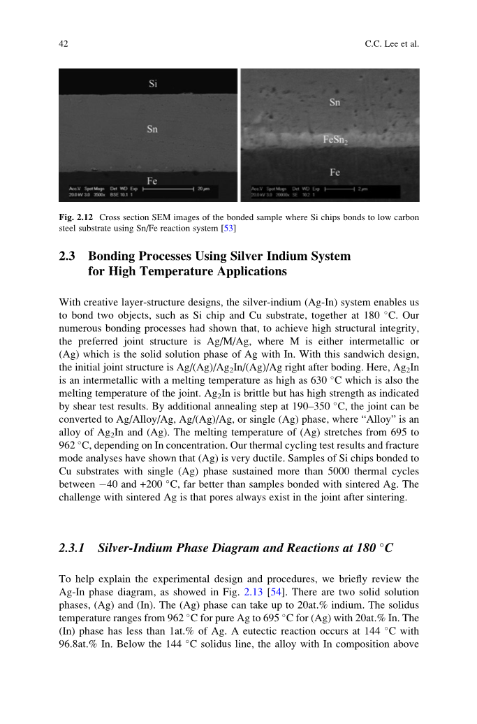 创意层结构设计,AgIn系统使我们能够使两个物体结合,如硅晶片和铜衬底,在180℃。我们众多的成键过程表明,为了达到较高的结构完整性,首选的连接结构为Ag/M/Ag,其中M为金属间质或(Ag),即Ag与In的固溶相。采用这种夹层结构设计后,初始节点结构为Ag/(Ag)/Ag2In/(Ag)/Ag。Ag2In是一个金属间化合物熔点高达630℃也是节点的熔化温度。Ag2In是脆性的,但具有高强度的剪切试验结果。额外的退火步骤在190 - 350℃,结合点可以转化成Ag /合金/ Ag)、Ag)/(Ag)/ Ag),或者单(Ag)阶段,“合金”是Ag2In的合金和(Ag)。(Ag)的熔化温度从695℃到962℃,取决于浓度。我们的热循环试验结果和断裂模式分析表明(Ag)是很容易延展的。如果铜基板与样品单(Ag)连接时在40-200℃之间保持超过5000热周期,远比样品与烧结Ag连接的好。烧结Ag的主要问题是在烧结后的接缝中始终存在气孔。