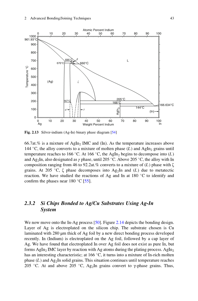 为了帮助解释实验设计和过程,我们简要回顾了AgIn相图,如图2.13。有两个固溶相,(Ag)和(In)。(Ag)相位可达In的20%。纯的固相温度范围从962℃ Ag - 695℃(Ag)20%。(In) 相位小于Ag的1%。共晶反应发生在含In量96.8%温度为144℃条件下。低于144℃固相线、合金成分高于66.7%是AgIn2 IMC和(In)的混合物。随着温度超过144℃,合金混合物转变为熔融阶段(液)和AgIn2晶粒,直到温度达到166℃。在166℃,AgIn2开始分解成(液体)和Ag2In,也被指定为gamma;阶段,直到205℃。205℃以上的合金成分从46%转变到92.2% (液体)的混合阶段zeta;晶粒。在205℃, 由于包晶反应zeta;相分解成Ag2In。我们学习了Ag和In在180℃的反应来识别和确认180℃附近的相组成。
