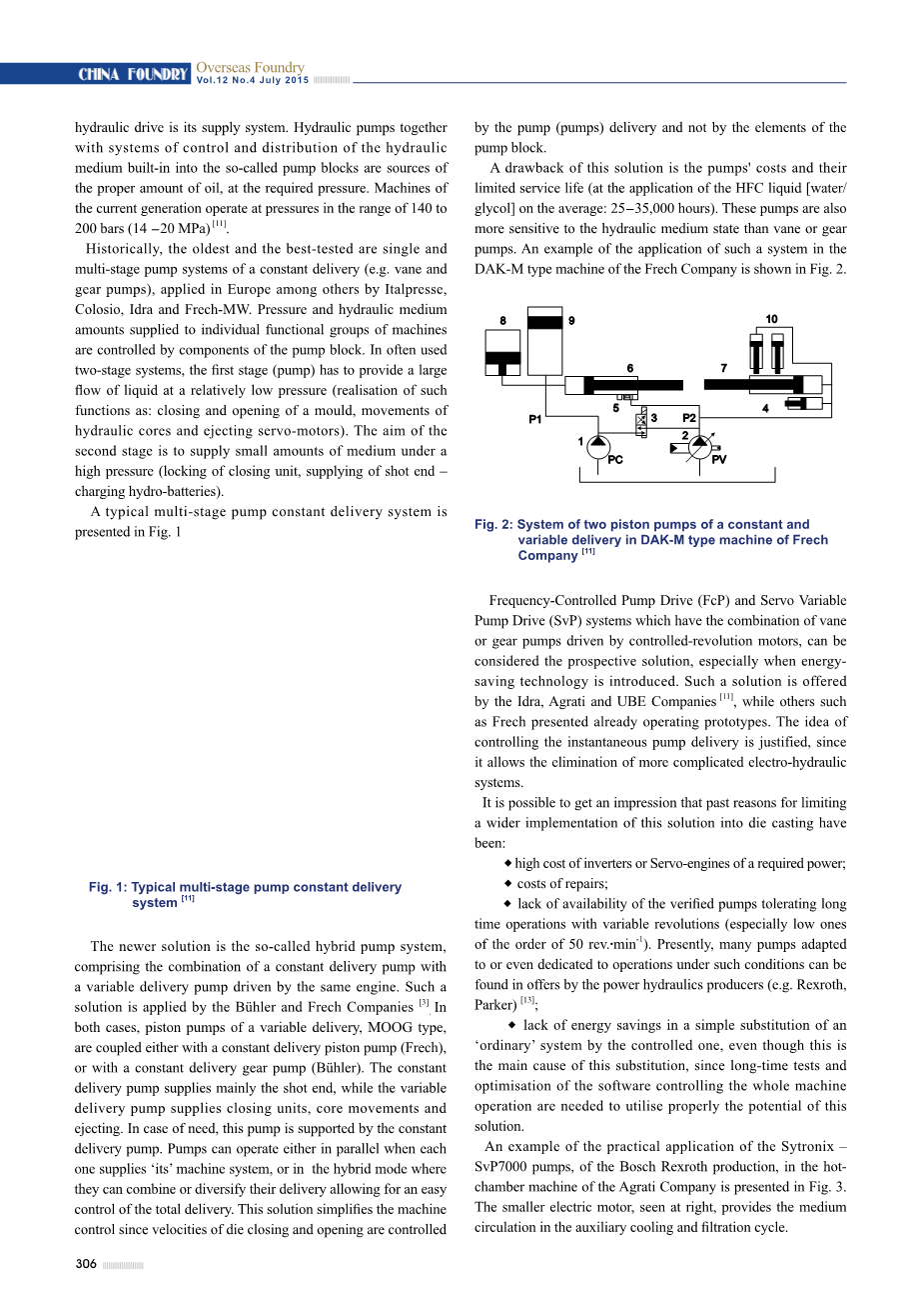较新的解决方案是所谓的混合泵系统,它由一个恒定的输送泵和一个由相同引擎驱动的变量输送泵的组合组成。bhler和Frech公司采用了这种解决方案。在这两种情况下,一个变量传递的活塞泵,即MOOG类型,都是与一个恒定的活塞泵(Frech),或者是一个恒定的输送齿轮泵(bhler)耦合的。恒压泵的主要供应源为射端,而变量输送泵则提供关闭装置、核心运动和喷射泵。在需要时,该泵由常压泵支持。当每个人都提供“它的”机器系统,或者在混合模式下,泵可以并行操作,在这种混合模式下,它们可以结合或多样化它们的交付,从而轻松控制总交付。这个解决方案简化了机器控制,因为关闭和打开的速度由泵(泵)的输送控制,而不是由泵组的元件控制。这种解决方案的一个缺点是泵的成本和它们有限的服务寿命(在HFC液体水/乙二醇的应用中平均为25-3.5万小时)。这些泵对液压介质状态比叶片或齿轮泵更敏感。图2展示了一个在Frech公司的达克-m型机器上应用这样一个系统的例子。