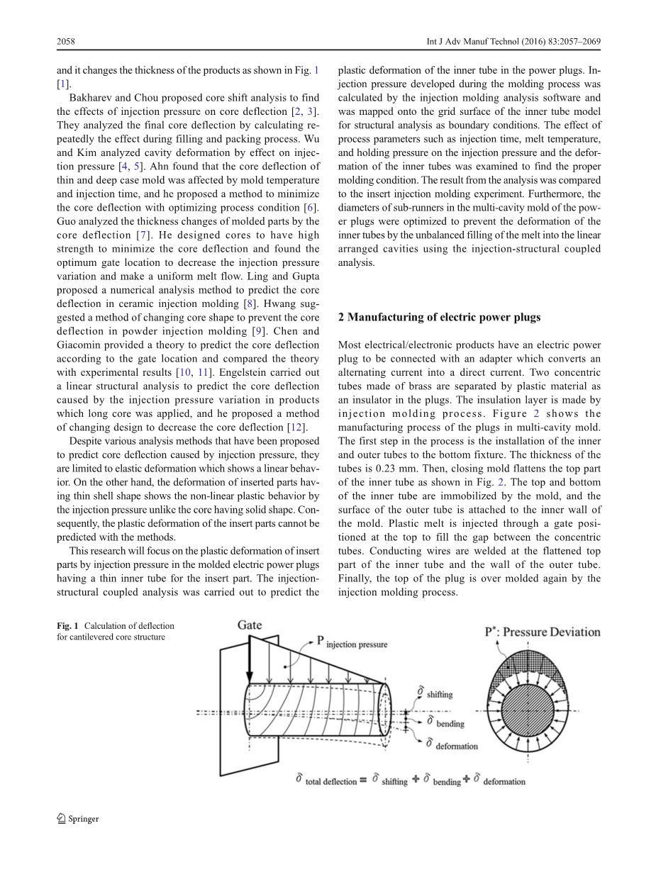 Bakharev和Chou提出了型芯移位分析法,以发现注射压力对型芯挠度的影响[2,3]。他们通过反复计算在充模和保压过程中产生的影响来分析最终的型芯挠度。Wu和Kim通过对注射压力的影响分析了型腔的变形[4,5]。Ahn发现,模具温度和注射时间影响了薄而深母模的型芯挠度,提出了一种通过优化工艺条件使型芯挠度最小的方法[6]。Guo分析了由型芯挠度引起的塑件厚度变化[7],设计了高强度的型芯,使型芯挠度最小化,并找到了最佳的浇口位置,减小了注射压力的变化,使熔体均匀流动。Ling和Gupta提出了一种数值分析方法来预测陶瓷注射成型的型芯挠度[8]。Hwang提出了一种改变型芯形状的方法,以降低粉末注射成型的型芯挠度[9]。Chen和Giacomin提供了一种理论,根据浇口的位置预测型芯挠度,并将理论与实验结果进行比较[10,11]。Engelstein进行了线性结构分析,预测了用到长型芯的产品注射压力的变化所引起的型芯挠度,并提出了一种通过改变设计来降低型芯挠度的方法[12]。