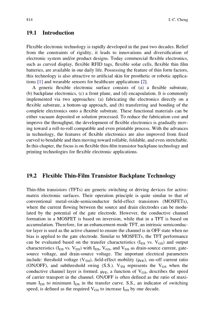 柔性电子技术在过去二十年中得到迅速发展。刚性的约束,导致创新和多样化电子系统和/或产品设计。今天商用柔性电子产品如曲面显示器,柔性RFID标签,柔性太阳能电池,柔性薄膜等电池,可在我们的日常生活中使用。拥有薄型外形的特点,这种技术对假肢或机器人应用的人造皮肤[1]和用于医疗应用的可穿戴传感器[2]也具有吸引力。通用的柔性电子表面由(a)柔性衬底,(b)背板电子器件,(c)前平面和(d)封装。这是常见的通过两种方法实现:(a)直接在a上制造电子器件柔性基底,自下而上的方法,和(b)转移和粘结完成电子元件到柔性基板上。这些功能材料可以真空沉积或溶液处理。为了降低制造成本和提高产量,柔性电子产品的发展正在逐步向卷对卷兼容甚至可印刷的过程发展。随着进步在技术上,柔性电子器件的特性也从固定的改善弯曲成可弯曲,然后朝着可卷曲,可折叠,甚至可拉伸的方向移动。在本章中,重点是灵活的薄膜晶体管背板技术和印刷技术用于柔性电子应用。