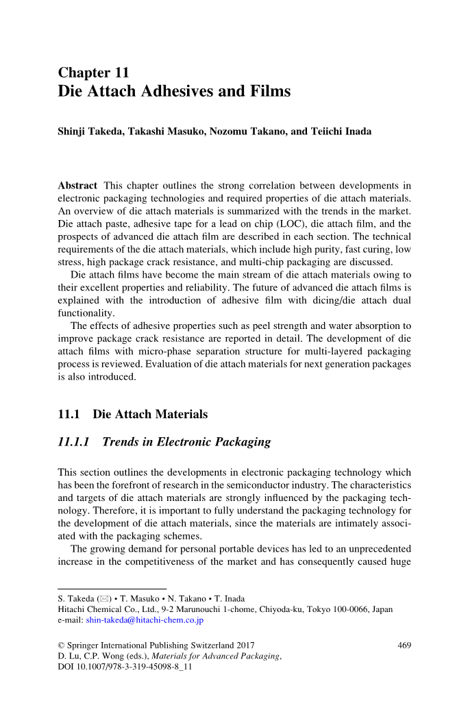 详细报道了粘合性能如剥离强度和吸水性的影响,综述了微相分离结构用于多层包装工艺的芯片贴膜的发展,也介绍了下一代封装的粘晶材料的评估。