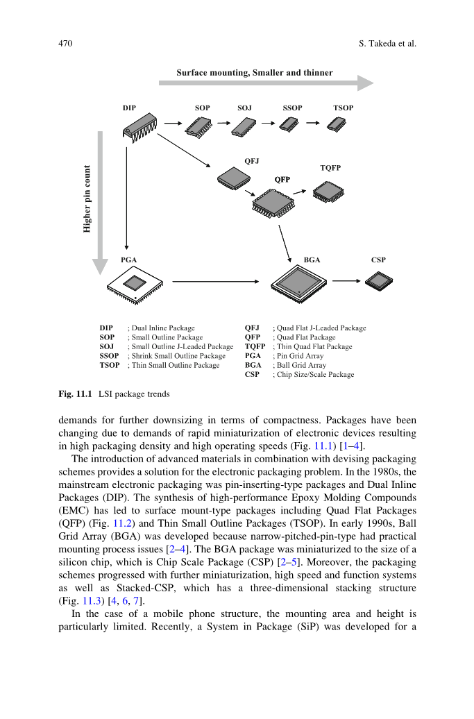 先进的材料和设计包装相结合的引入为电子封装问题提供了解决方案。在20世纪80年代,主流电子封装是引脚插入型封装和双列直插封装(DIP)。高性能环氧树脂成型化合物(EMC)的合成促成了表面贴装型封装,包括四扁平封装(QFP)和薄型小外形封装(TSOP)。在20世纪90年代早期,球栅阵列(BGA)的开发是因为窄间距针型有实际的安装过程问题。BGA封装被微型化为芯片尺寸封装(CSP)[2-5]的硅芯片尺寸。此外,电子包装小型化,高速化和功能化系统以及具有三维堆叠结构的Stacked-CSP将进一步发展。