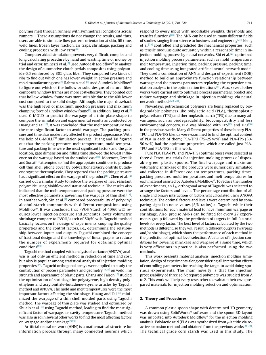 纯正PLA、PLA-TPU和PLA-TPS被选为一次性塑料勺子的注射成型工艺的三种不同材料。在Moldflow的帮助下,我们对不同的冷却剂温度、保压时间、保压压力、模具温度、熔体温度下的产品翘曲和最大体积收缩进行了模拟和数据记录。为了减少实验次数,研究者选择了田口L27正交阵列来排列相关因素和缺陷等级并利用方差分析技术计算了所有单因素和二元因素的作用程度百分比。通过对田口方法信噪比的比较,我们得到了使每种材料翘曲和收缩最小的参数。此外,全部27个实验组都可以精确安装ANN从而对每个因素的影响程度作出预测。由上述两种方法得出的最佳参数是不同的,所以它们也会产生不同程度的翘曲的收缩,从而可以看出每种方法在最佳参数选择过程中的优劣。两种方法综合使用也是一种非常有效的减少收缩和翘曲的方法。