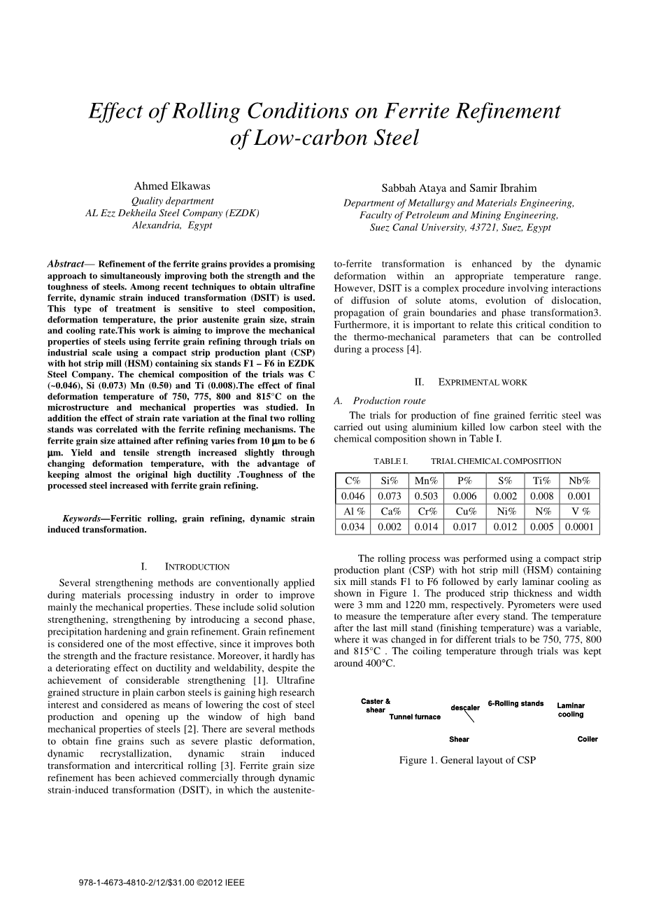 摘要:铁素体晶粒的细化为同时提高钢的强度和韧性提供了一种很有前途的方法。在最新的技术中,动态应变诱导相变(DSIT)可用于获得超细晶粒铁素体。这种类型的处理对钢的组成,变形温度,尤其是奥氏体晶粒尺寸,应变和冷却速率很敏感。这项工作使用的是紧凑式带钢生产厂(CSP)与ezdk钢公司的含六道轧辊F1到F6热连轧机(HSM)在内的工业规模试验钢,以提高铁素体晶粒细化后的机械性能。试验的化学成分为C(~0.046)、Si(0.073)、Mn(0.50)和Ti(0.008)。试验研究了最终变形温度分别在750、775、800和815°C时对组织和力学性能的影响。此外,应变速率在最后两个滚动轧机上变化的效果与铁素体的细化机制有关。精炼后的铁素体晶粒尺寸由10mu;m变化为6mu;m。通过改变变形温度,在有利于保持原来的高延展性的同时,材料屈服强度和抗拉强度略有增加。而且随着铁素体晶粒的细化,钢在处理后的韧性也会增加。