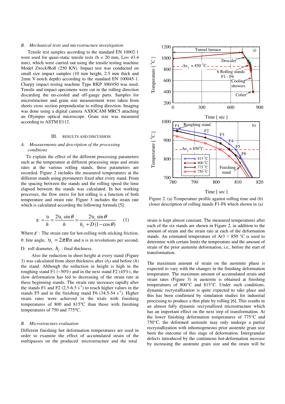 为了检验在多层结构应变时产生的积累应变的成果,应设置不同的热加工变形温度,且总应变几乎保持不变。六个轧辊上测得的温度如图2所示,此外还有在每个机架上应变和应变率的值。在转变开始前,一定范围的温度和奥氏体晶粒变形量的确定的估算温度为Ar3 asymp; 850℃。