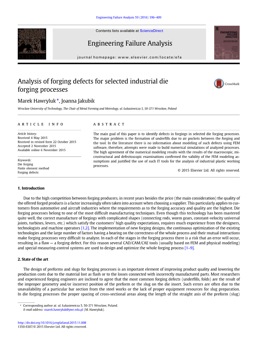锻造过程的预型件和模件的设计是提高产品质量和降低生产成本的一个重要因素,原因是材料几乎不损失,或者是仅仅由于制造零件不正确的方法而导致损失。大多数研究人员和经验丰富的锻造工程师倾向于认为最常见的锻造缺陷(填料、褶皱)的原因是预制件或模件的不正确的几何形状和/或不正确的位置。这种错误往往是由于从钢铁厂、段塞制备合适的设备资源缺乏,或者特定型材不可用。在模锻过程中,沿长度适当间距的横截面面积的预制件(段)的直轴和在成型过程中后者的准备,对材料合理填充至模具都起到至关重要的作用[10,11]。锻造缺陷的其他原因包括:钢坯温度过低,使用过强的坯料,不恰当的制造工具,不完全移除规模,和粗糙的技术。锻造是负责大部分缺陷的原因,但锻造并不是直接责任的因素,但它可以控制和监督,以不使其产品质量恶化[6–9,11–12]。