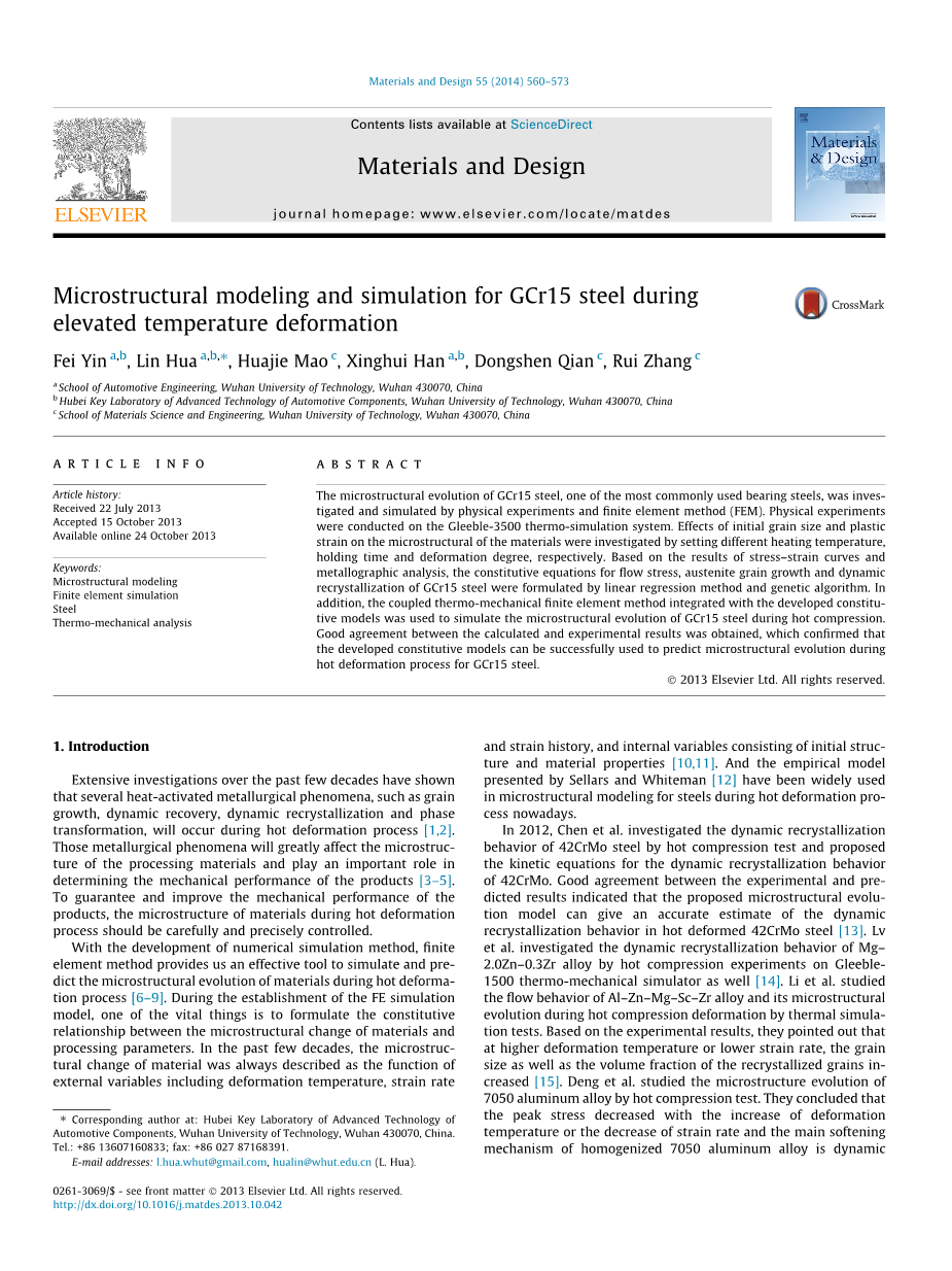 通过物理实验和有限元方法(FEM)研究和模拟最常用的轴承钢之一的GCr15钢的显微组织演变,其中,物理实验是在Gleeble-3500热模拟机上进行。通过设定不同的加热温度、保温时间和变形程度,研究初始晶粒尺寸和塑性应变对材料微观组织的影响。基于应力 - 应变曲线和金相分析的结果,采用线性回归法和遗传算法建立GCr15钢的流变应力,奥氏体晶粒长大和动态再结晶的本构方程。此外,将推导出的本构模型和耦合热力学有限元方法结合模拟出GCr15钢在热压缩过程中的微观组织演变。模拟结果与实验结果吻合良好,这也证实了推导的本构模型可以很好地用于预测GCr15钢热变形过程中的微观组织演变。