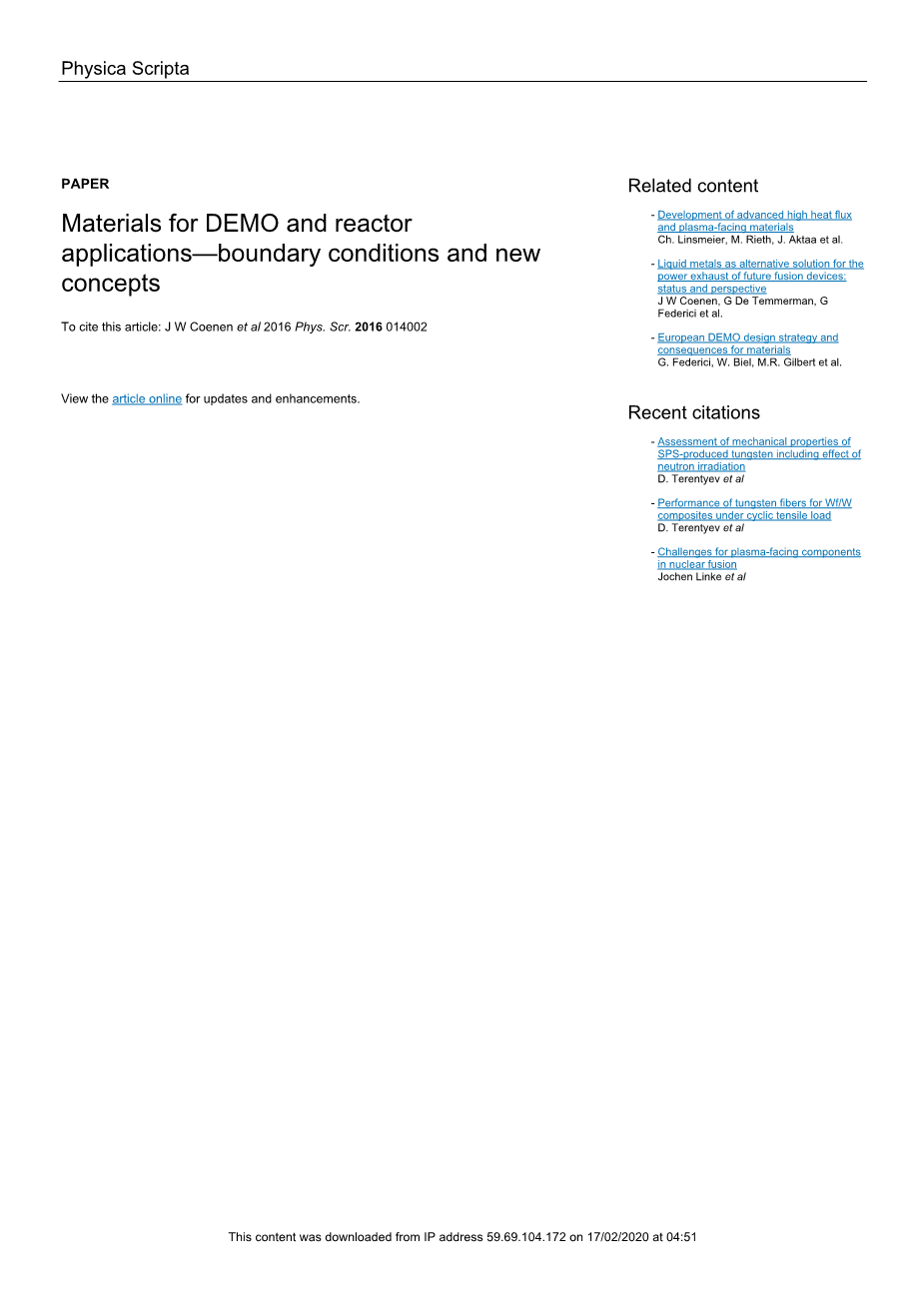 DEMO是第一阶段原型聚变反应堆的名字,被认为是ITER(国际热核聚变试验堆计划)之后实现聚变的下一步。特别是对于聚变能的实现,材料问题已经成为当今的重大挑战。热载荷、粒子载荷和中子载荷是推断材料寿命的重要问题。对于面临的许多问题,先进材料解决方案正在讨论或已经在开发中。特别是,像反应器的第一壁和偏滤器这样的部件可以通过引入复合材料或新合金等新方法来获益。开裂、氧化和燃料管理是决定使用新材料时的主要问题。在这里,Wf /W复合材料以及增强的CuCrZr组件和抗氧化钨合金一起向聚变反应堆迈进。此外,中子诱发效应如嬗变、脆化、余热和活化是必不可少的。因此,在设计组件时,需要考虑所有方面的方法。
