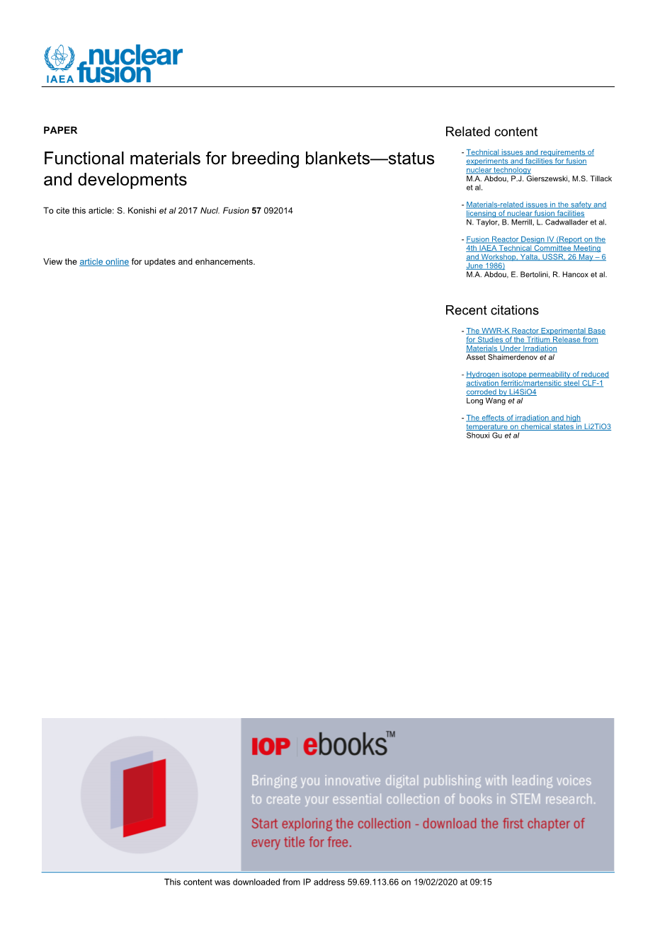 本篇文章回顾了DEMO反应包层中氚增殖层,中子倍增剂和内嵌流道材料的进展。ITER的实验包层模型(TBM),采用了球床结构,Be中子倍增剂。实验取得积极进展,实验中设计的,验证还在进行中。在辐照环境下,Be的导热系数减小,材料肿胀的情况在有限的实验数据中有出现。ITER的实验成果是里程碑式的。在DEMO环境,已经尝试了更高的锂含量的增殖层,并且已经研究了具有优异化学稳定性的和其他铍化物。LiPb共晶在液态增殖层选项中被视为DEMO包层,并被用作冷却剂以达到更高的出口温度。 SiC内嵌流道用于防止磁流体动力压降和腐蚀。人们认识到,ITER TBM和DEMO之间存在巨大的技术差距,世界范围内聚变组织正在同时开发ITER TBM和DEMO模块。