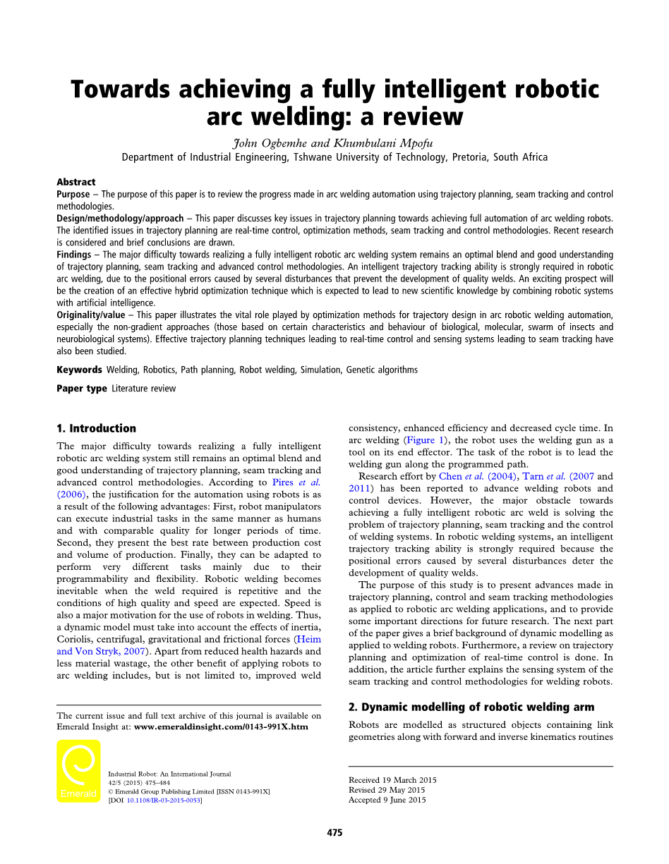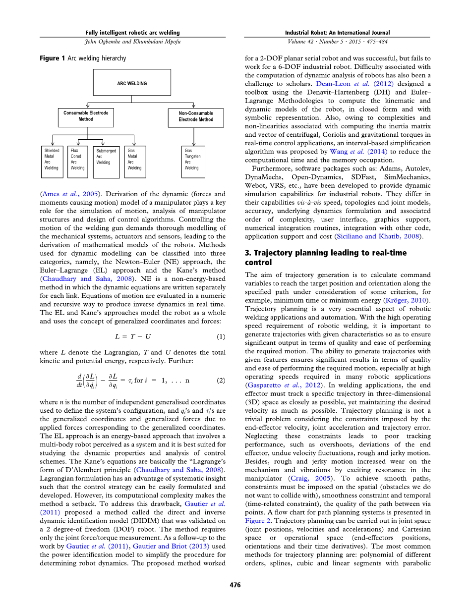 目的 - 本文的目的是回顾使用轨迹规划,焊缝跟踪和控制方法在弧焊自动化方面取得的进展。