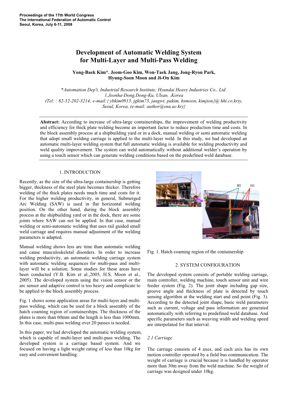 摘要:随着超大型集装箱船的增加,厚板焊接生产效率和效率的提高成为缩短生产时间和降低成本的重要因素。在造船厂或码头的板块组装过程中,采用小焊接车架的手动焊接或半自动焊接应用于多层焊接。在这项研究中,我们开发了一种自动多层焊接系统,可以使用全自动焊接来提高焊接生产率和焊接质量。通过使用可以基于预定义焊接数据库生成焊接条件的触摸传感器,系统可以自动焊接而无需额外的焊工操作。
