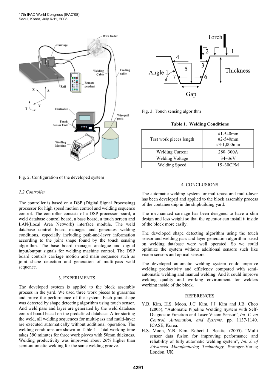 开发的系统包括便携式焊接托架,主控制器,焊接机,接触式传感器单元和送丝机系统(图2)等四部份组成。 在焊接起点和终点通过触摸传感算法检测包括间隙尺寸,坡口角度和板厚的接合形状(图3)。 根据检测到的接头形状,参考预定义的焊接数据库自动生成基本焊接参数,例如电流,电压和通过信息。 并且针对该间隔内插特定参数,例如测量宽度和焊接速度以及测量精度等因素。