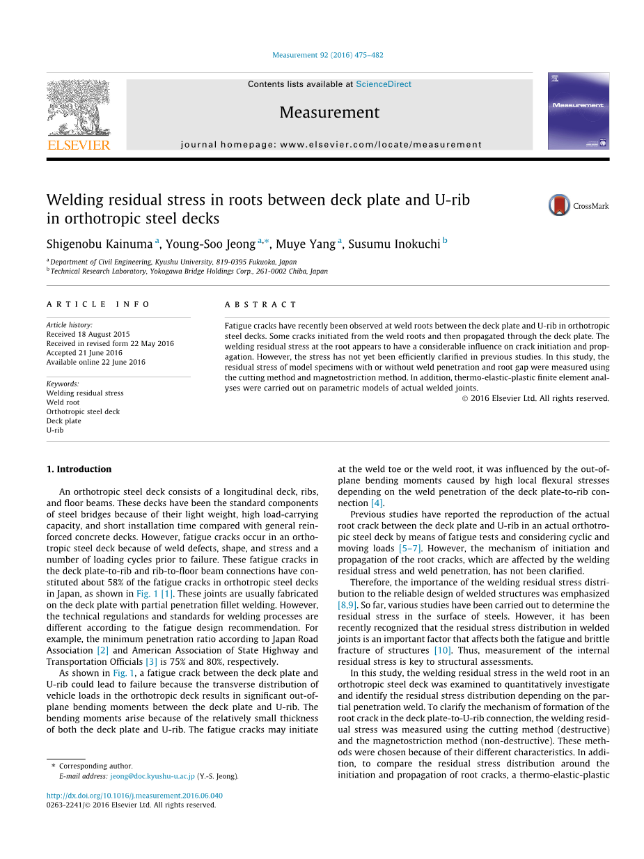 本文研究了正交异性钢桥面焊缝根部的焊接残余应力,定量地研究和鉴定了局部熔透焊缝的残余应力分布。为阐明桥面板-U肋连接根部裂纹的形成机理,采用切割法(破坏法)和磁致伸缩法(无损法)测量了焊接残余应力。这些方法因其不同的特点而被选择。此外,为了比较根裂纹的萌生和扩展周围的残余应力分布,一种热弹塑性有限元分析方法被应用到研究桥面板和U形肋厚度的变化、焊缝熔深比和根隙尺寸的变化。