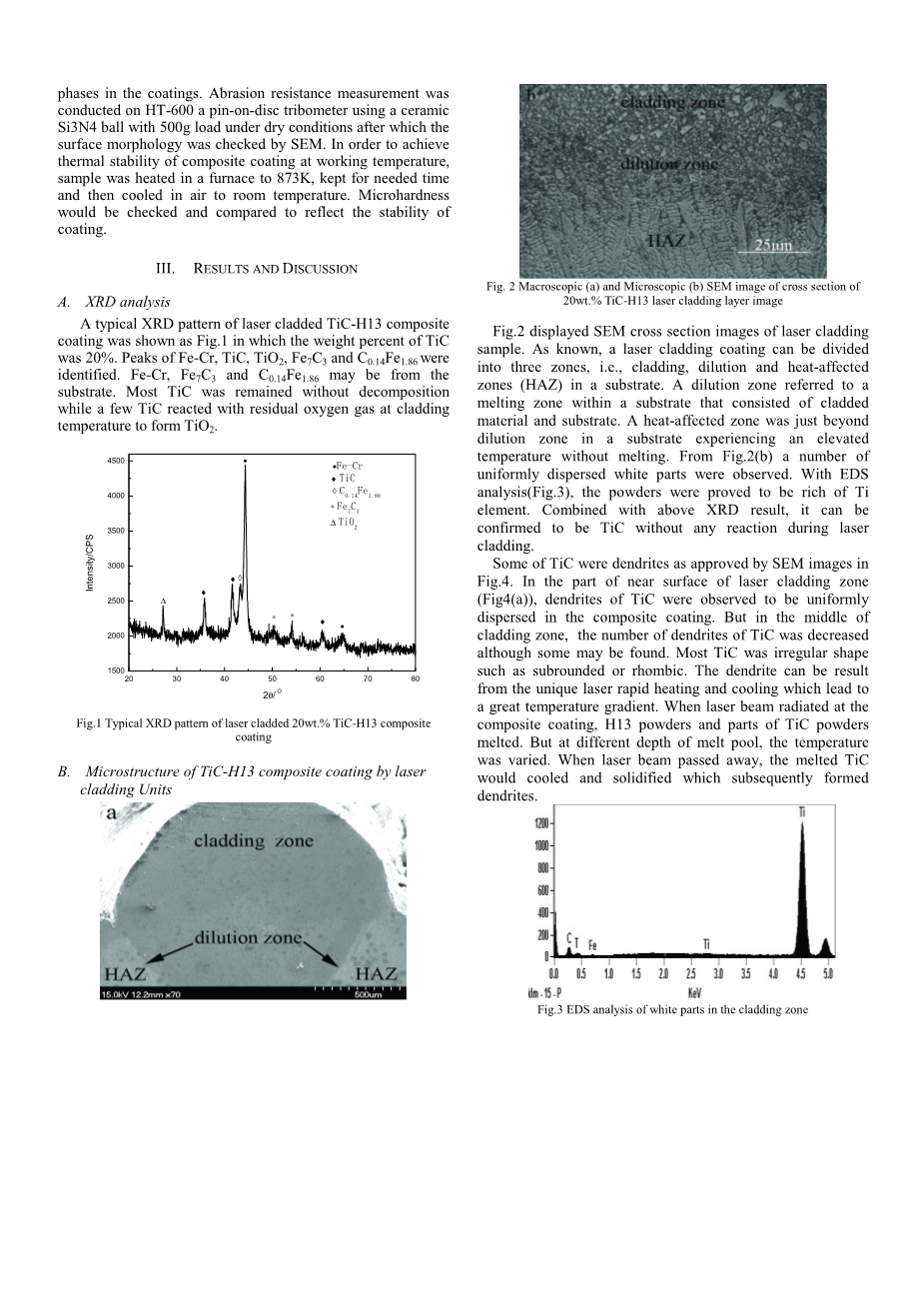 图2显示了激光熔覆样品的SEM横截面图像。众所周知,激光熔覆涂层可分为三个区域,即基板中的包层,稀释区和热影响区(HAZ)。稀释区是指基底内由熔覆材料和基底组成的熔化区。热影响区刚刚超出基板中的稀释区,随着温度的升高而没有熔化。从图2(b)中观察到许多均匀分散的白色部分。通过EDS分析(图3),证明粉末中富含Ti元素。结合上述XRD结果,在激光熔覆期间没有发生任何反应的TiC。