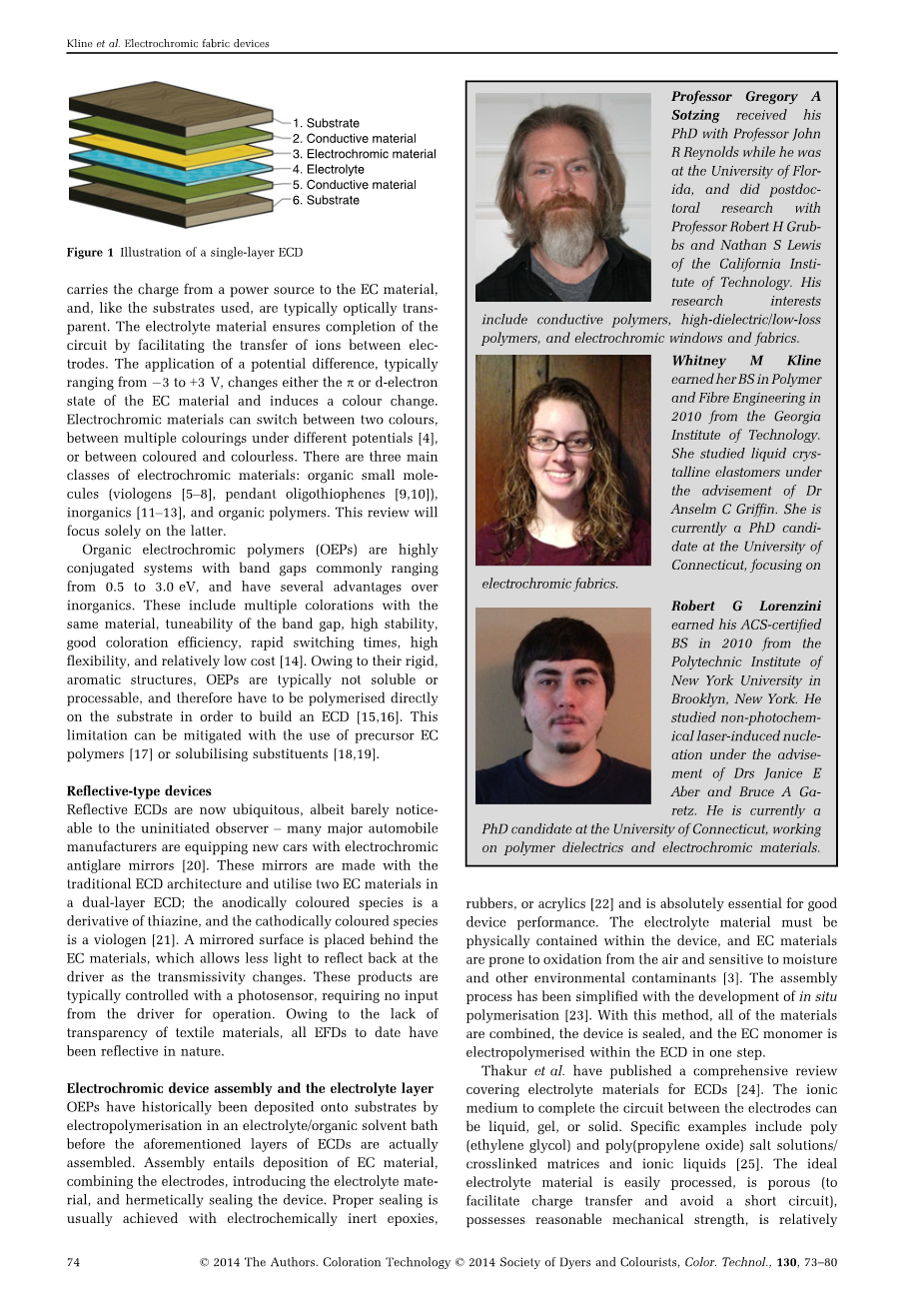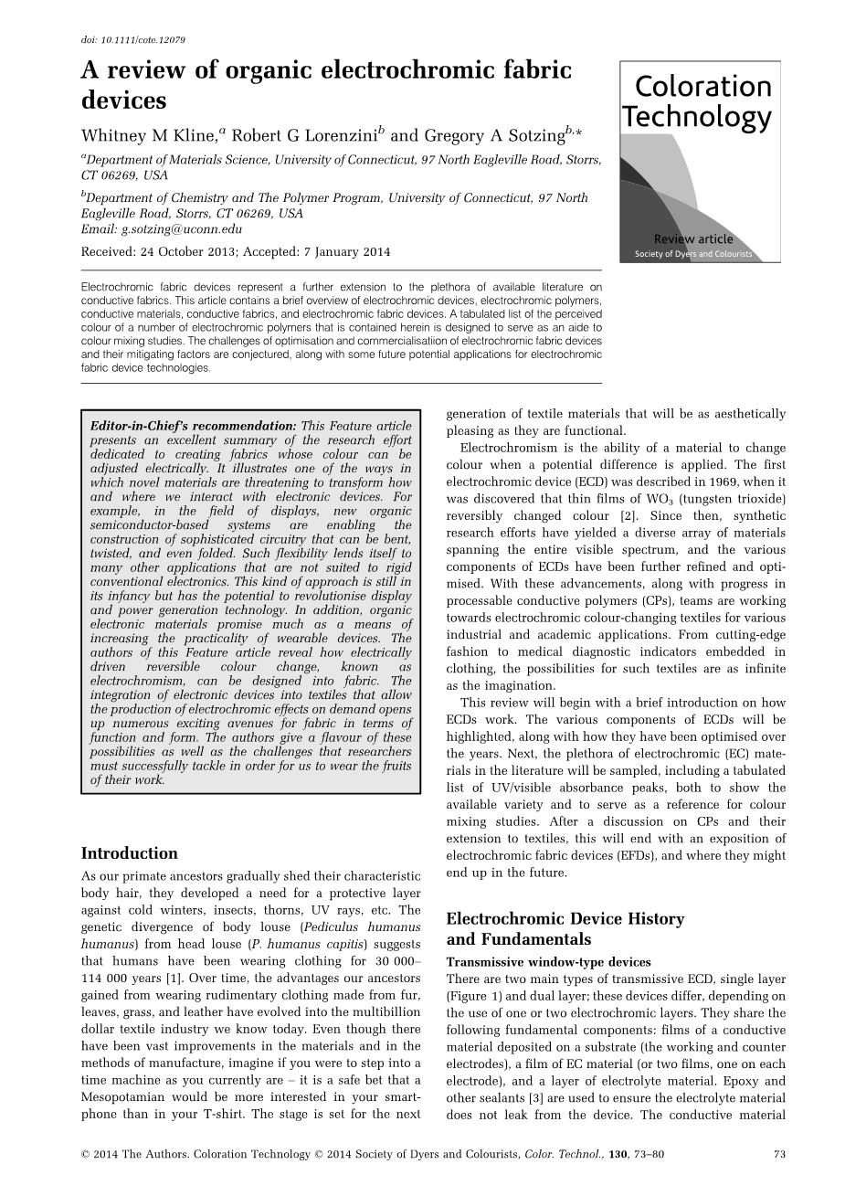 这篇专题文章对研究工作进行了精彩的总结致力于创造颜色可以的织物电气调整。它说明了其中的一种方式这些新材料正在威胁着如何改变以及我们与电子设备互动的地方。对于例如,在显示器领域,新的有机产品基于半导体的系统正在实现这一点可以弯曲的复杂电路的构造,扭曲,甚至折叠。这种灵活性适合于许多其他不适合僵化的应用程序传统电子。这种方法仍然存在其婴儿期,但有可能彻底改变显示发电技术。另外,有机电子材料很有可能成为一种手段增加可穿戴设备的实用性。该这篇专题文章的作者揭示了如何电气驱动可逆的颜色变化,被称为电致变色,可以设计成面料。该将电子设备整合到纺织品中需求产生电致变色效应为织物提供了许多令人兴奋的途径功能和形式。作者给出了这些的味道可能性以及研究人员的挑战必须成功解决,以便我们穿上水果他们的工作。一介绍随着我们的灵长类祖先逐渐摆脱其特征体毛,他们开发出需要保护层对抗寒冷的冬天,昆虫,荆棘,紫外线等体虱的遗传分化(Pediculus humanus来自头虱(P. humanus capitis)的人类表示人类穿着3万多件衣服,114 000年。随着时间的推移,我们的祖先的优势从穿着由毛皮制成的基本服装获得,叶子,草皮和皮革已经演变为数十亿美元我们今天所知的美元纺织业。即使在那里在材料和材料方面有了很大的改进制造方法,想象如果你要踏入一个时间机器,你现在是 - 这是一个安全的赌注,一个美索不达米亚人会对你的智能手机更感兴趣比你的T恤衫。舞台为下一个设置这些纺织材料的生成将具有美感令人满意,因为它们是功能性的电致变色是材料改变的能力当施加电位差时颜色。首先电致变色装置(ECD)在1969年被描述,当时它发现WO3(三氧化钨)薄膜,可逆地改变颜色[2]。从此,合成研究工作已经产生了各种各样的材料跨越整个可见光谱,以及各种CD的组件已经进一步完善和优化。随着这些进步,以及进步可加工导电聚合物(CP),团队正在努力用于各种电致变色变色纺织品工业和学术应用。从尖端时尚到嵌入式医疗诊断指标服装,这种纺织品的可能性是无限的作为想象力。这篇评论将首先简要介绍如何ECD工作。 ECD的各个组成部分将会是突出显示,以及它们如何被优化这些年。接下来,电致变色(EC)材料的过多在文献中将被采样,包括一张表紫外/可见吸收峰的列表,两者都显示出来可用的品种和作为颜色的参考混合研究。在讨论CP和他们的意见之后延伸到纺织品,这将结束与博览会电致变色织物装置(EFD),以及它们可能在哪里在未来结束。