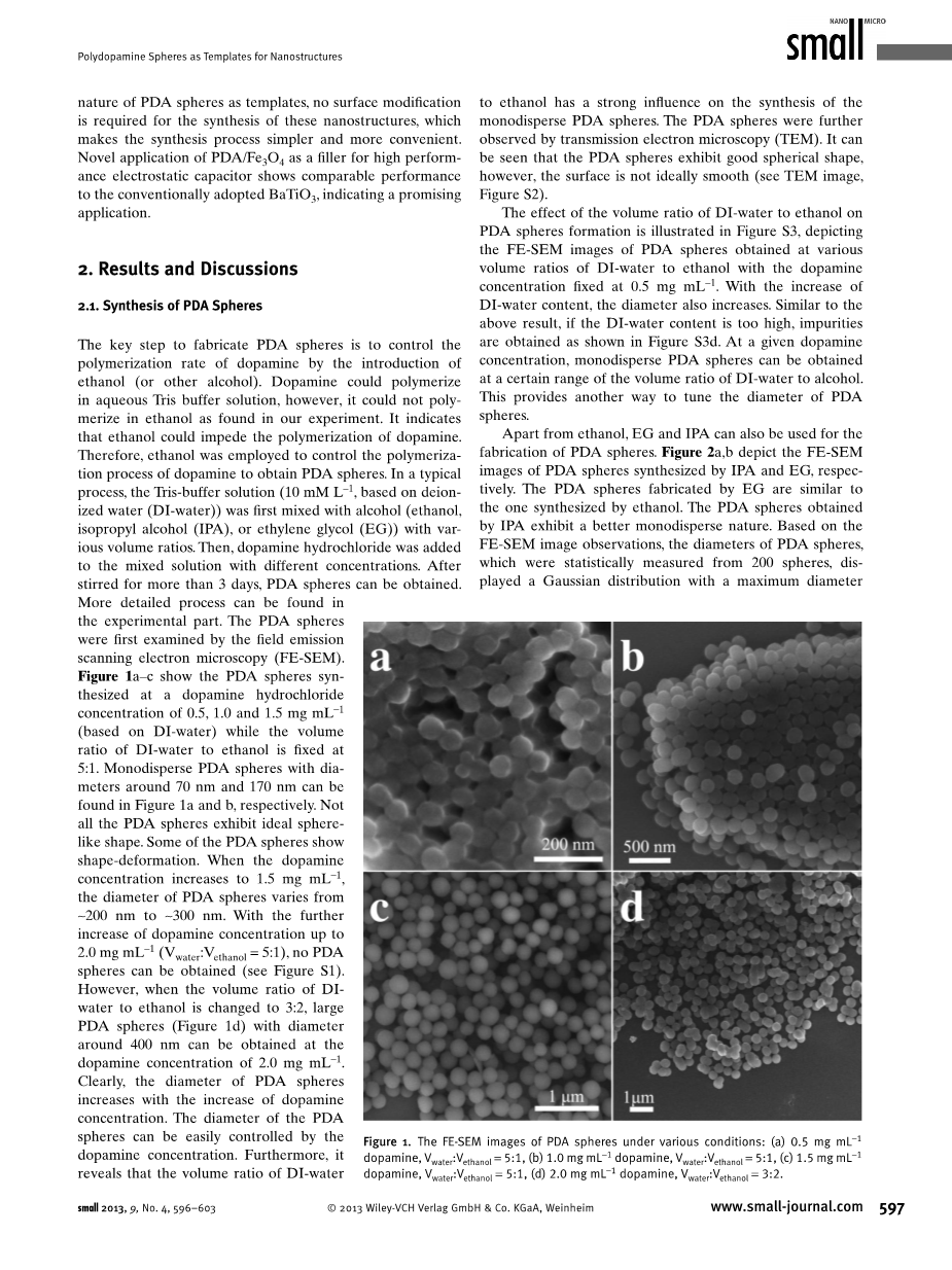 对去离子水在PDA领域形成乙醇体积比效果图S3的插图,描绘了当多巴胺浓度固定在0.5 mg mL minus; 1时不同去离子水乙醇体积比下合成的PDA球体的FE-SEM图片。随着去离子水含量的增加,直径也增大。类似上述的结果,如果去离子水含量太高,得到如图S3d显示杂质。在给定的多巴胺浓度,单分散的PDA领域可以在一定范围内的去离子水乙醇体积比得到的。这为调整PDA球体的直径提供了另一种方法。