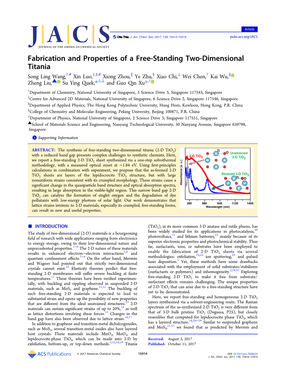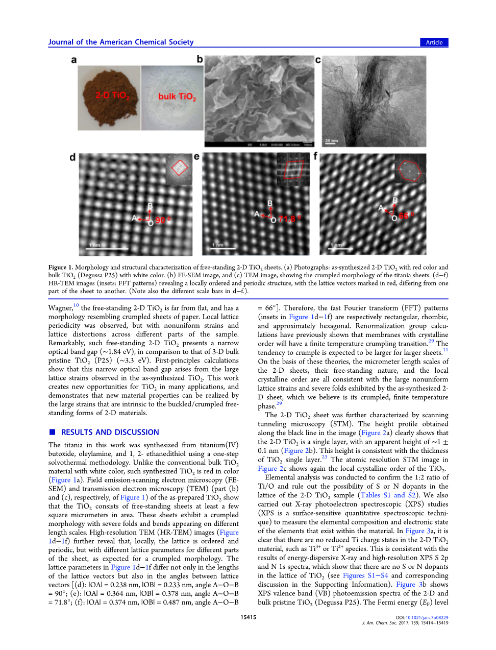 摘要:合成具有较小带隙的自支撑二维二氧化钛对于合成化学家来说仍是复杂的挑战。这里,我们汇报了一种通过一步水热法合成的2-D TiO2片,其禁带宽度在1.84ev左右。结合实验并利用第一性原理计算,我们得出这样制得的2-D TiO2片为层状纤铁矿结构,但存在很大的非均匀应变,呈现褶皱状。这些应变导致其准粒子带与光学吸收光谱发生很大变化,使其在可见光范围内能够实现很大的吸收。这种窄禁带宽度的2-D TiO2利用大阳光中的低能量光子便能催化生成单线态氧并降解燃料污染物。我们的工作证明了二维材料固有的晶格应变,尤其是褶皱与自支撑的性质能导致新的,有用的性能。