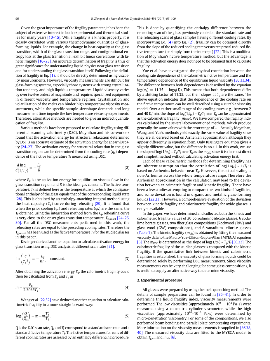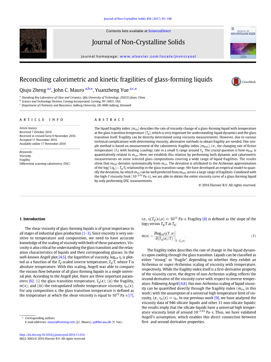 摘要:液体脆性指数(mvis)描述了在玻璃化转变温度(Tg)处玻璃形成液体时,粘度随温度的变化率,这对于理解液体动力学和玻璃态转变很重要。通过粘度测试可以直接测定强弱性。然而,目前由于测量粘度的方法有各种技术难题,因此,我们需要可替代的方案来获得强弱性。一个简单的方法是基于量热测试的强弱性指数(mDSC),在Tg附近的一个小的Tf范围内假想温度(Tf)随加热(冷却)速率的变化率。关键问题是DSC如何在数值上与mvis相联系。在此方面,我们选定一些不同组成的玻璃,它们的液体强弱性不同,通过表征它们的动力学强弱性和量热测量的强弱性来建立联系。结果表明mDSC系统地偏离了m vis。偏差是由于在玻璃化转变范围内Arrhenian近似(1/qc)〜Tg /Tf。我们制定了一个经验模型来量化偏差 ,从而在各种强弱性范围内mDSC可以很好地预测mvis。结合高温度粘度极限(10 -2.93 Pa·s),我们仅通过DSC测量得到了玻璃形成液体的整个粘度曲线.