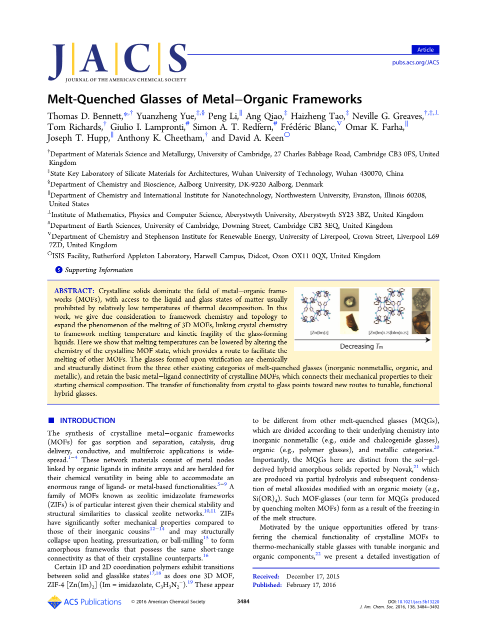 作者:Thomas D. Bennett, Yuanzheng Yue, Peng Li, Ang Qiao, Haizheng Tao, Neville G. Greaves, Tom Richards, Giulio I. Lampronti, Simon A. T. Redfern, Frederić́ Blanc, Omar K. Farha, Joseph T. Hupp, Anthony K. Cheetham, and David A. Keen