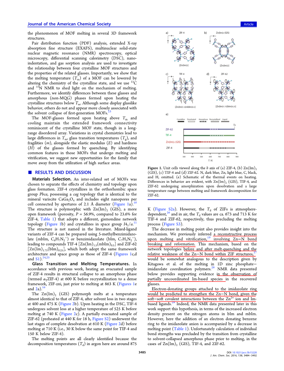 图1.沿着(a)ZIF-4,(b)Zn(Im)2(GIS),(c)TIF-4和(d)ZIF-62的轴线b观察的单元细胞。 N,深蓝色,Zn,浅蓝色,C,黑色和H,省略。(e)加热过程中的示意图。 Zn(Im)2(GIS),TIF-4和ZIF-62在去溶剂化时和在ZIF-62的熔融和骨架分解之间的大范围温度内经历无定性化,所以行为上的差异是显而易见的。