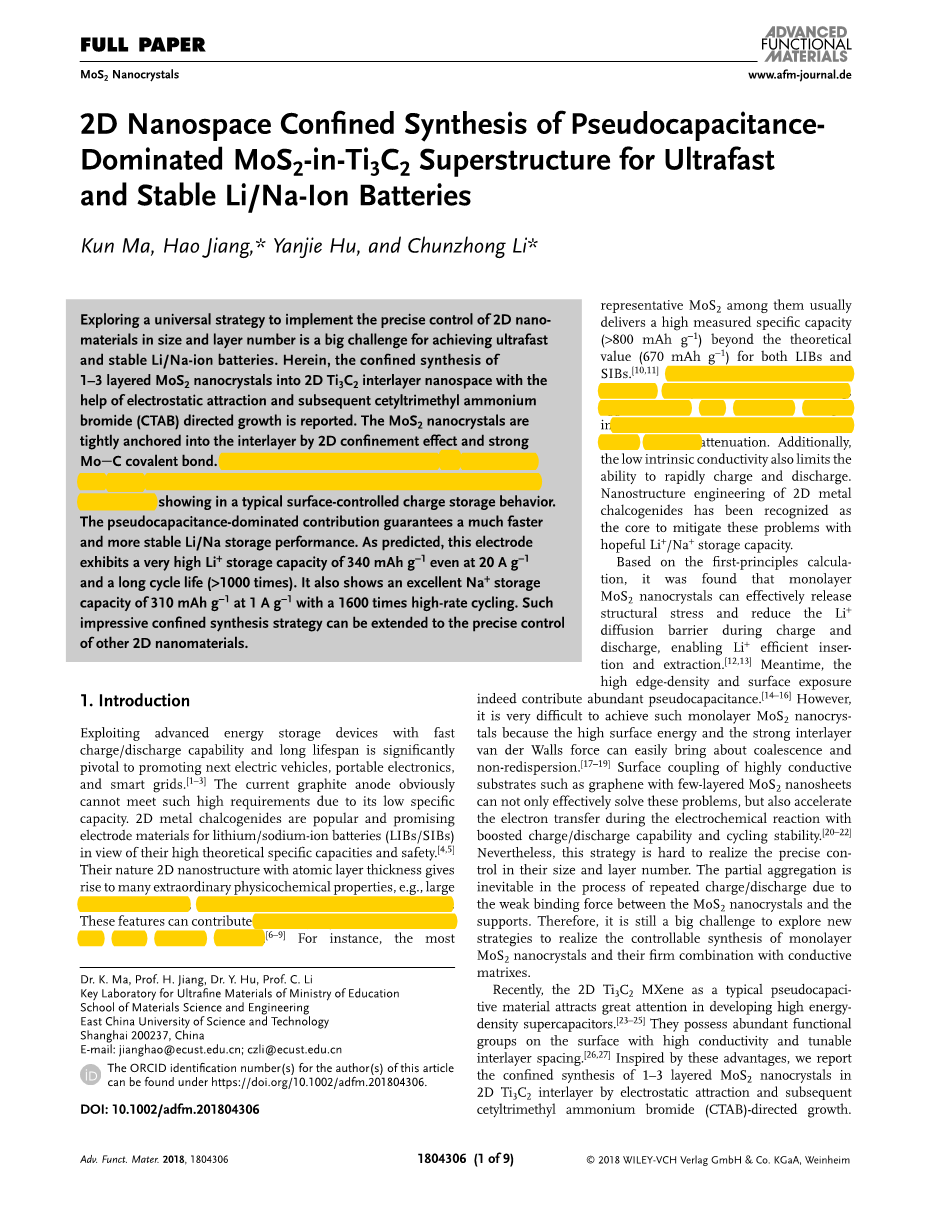 探索实现二维纳米材料尺寸和层数精确控制的通用策略,对于实现超快速且稳定的锂/钠离子电池来说是一个巨大的挑战。本文报道了借助静电吸引和随后的十六烷基三甲基溴化铵(CTAB)定向生长,将1-3层MoS2纳米晶体合成至2D Ti3C2中间层纳米空间。MoS2纳米晶体通过2D约束效应和强大的Mo-C共价键牢固地固定在中间层中。