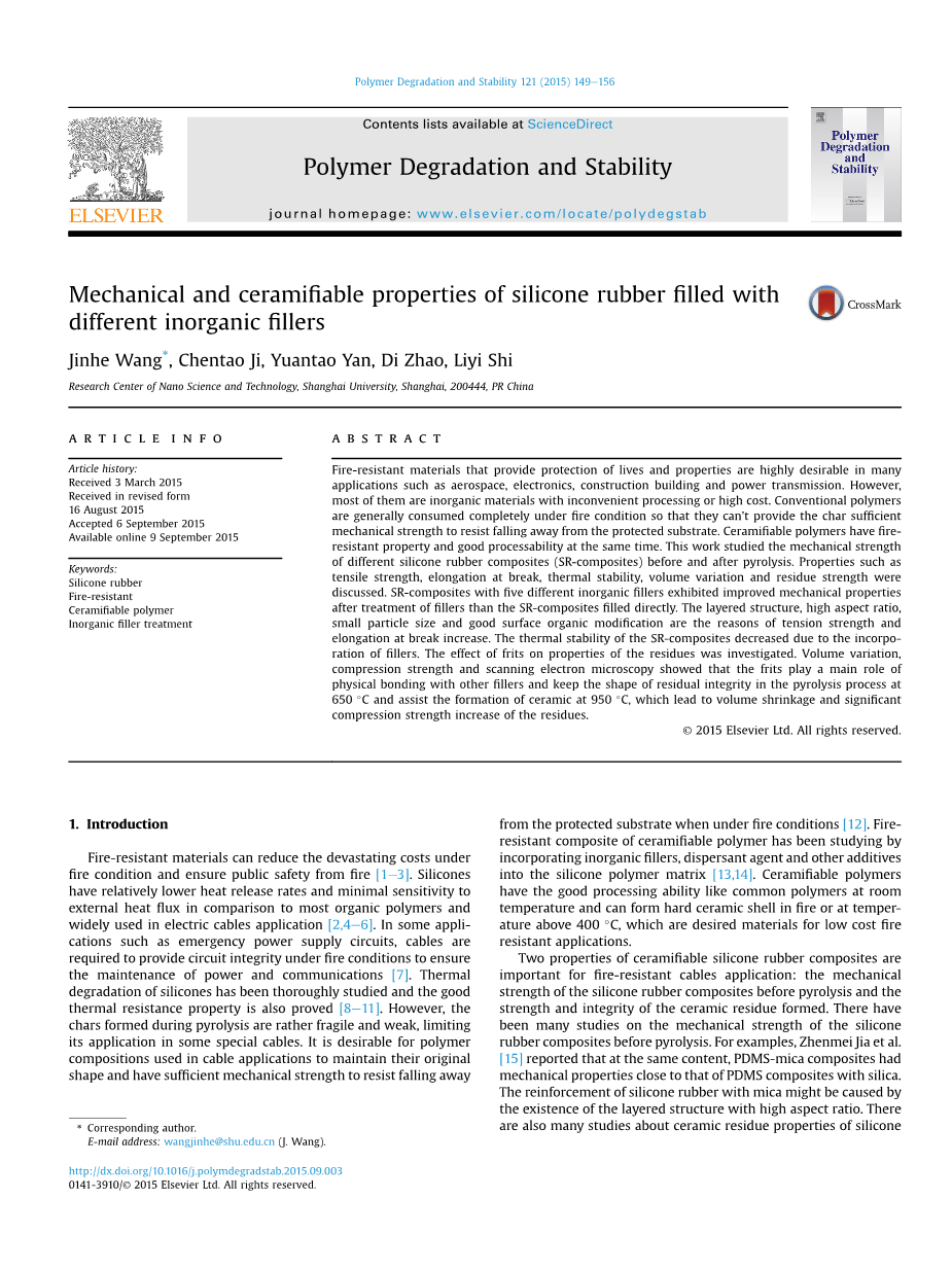 摘要:耐火材料在许多邻域如航空航天,电子,建筑和电力传输中非常重要,它为我们提供生命和性能的保护。然而,绝大多数耐火材料都是不方便加工或成本高的无机材料。传统的聚合物一般在火灾下会燃烧殆尽,因此,他们不能提供这些焦炭足够的机械强度,以至于不会从受保护的基板上脱落。可瓷化聚合物同时具有耐火性能和良好的加工性能。本文研究了不同硅橡胶复合材料(SR-复合材料)热解前后的机械强度,并对如拉伸强度,断裂伸长率,热稳定性,体积变化和残余强度等性能进行了讨论。与其他硅橡胶复合材料相比,用五种不同的无机填料填充的硅橡胶复合材料表现出了优异的机械性能。例如其具有层状结构,高长径比,小颗粒尺寸和良好的表面有机改性,这是拉伸强度和断裂伸长率提高的原因。硅橡胶复合材料的热稳定性随填料的掺入而下降。同时研究了添加剂对残渣性能的影响。体积变化,压缩强度和扫描电子显微镜观察表明,玻璃料发挥是其它填料的物理粘合的主要作用,保持了热解过程在650℃时剩余形状的完整性,并协助陶瓷在950℃下的形成,这导致体积收缩率和残留物的压缩强度显著增加。