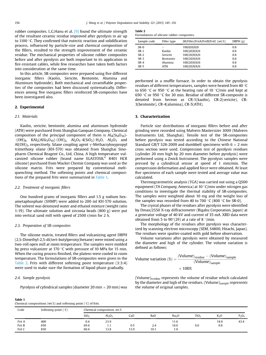 研磨前后的无机填充剂粒度我们使用马尔文的Mastersizer3000(马尔文仪器有限公司,上海)来进行记录。热解前的硅橡胶复合材料的拉伸试验,根据中国国家标准GB/ T528-2009和哑铃标本62 mm截面进行测试。热分解残留物(样品热解前为高20 mmtimes;直径20 mm的圆柱)的压缩试验用Zwick仪器进行。该热解的样品由圆柱形传感器以1 mm/ min的速度挤压,并得到的压缩变形力和施加力。每个样品中的至少用五个试样进行了测试,并计算出平均值。