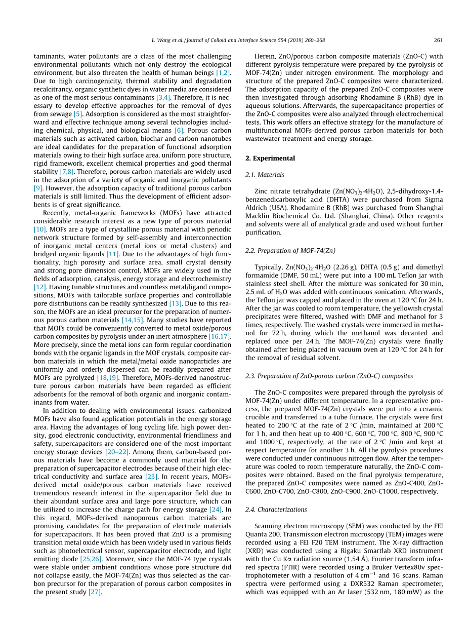 由MOF-74 (Zn)制备具有超快吸附污染物能力和超电 容特性的多功能多孔Zn0-C复合材料外文翻译资料