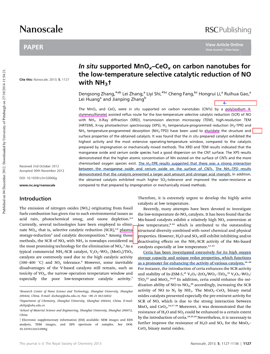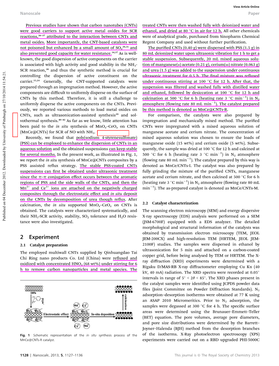 碳纳米管上原位负载的MnOx–CeOx,用于NH3低温选择性催化还原NO外文翻译资料