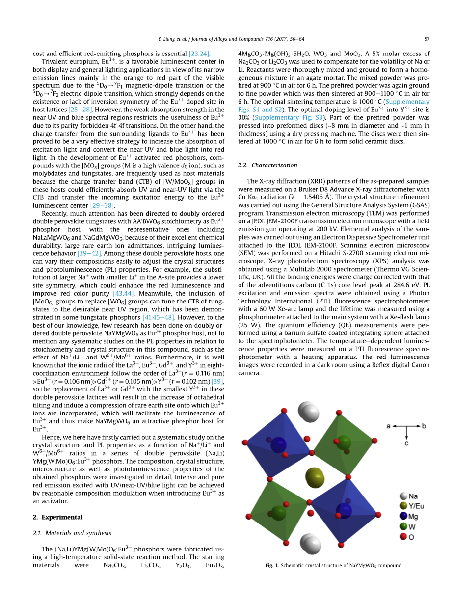近年来,人们对AA #39;BWO6化学计量的双序双钙钛矿钨酸盐作为Eu3 荧光粉的载体而倍受关注,以NaLaMgWO6和NaGdMgWO6为代表,因其具有优异的化学耐久性、较大的稀土离子导纳和良好的发光性能。在这些双钙钛矿基质中,可以容易地改变它们的组成以调节晶体结构和光致发光(PL)性能。例如,在A位点用较小的Li 取代较大的Na ,使得位点对称性较低,这可以增强红色发光并改善红色纯度。同时,加入[MoO6]基团取代[WO6]基团可以将钨酸盐的CTB调整到理想的近紫外区域,这已在一些钨酸盐荧光粉中得到了证实。然而,据我们所知,关于双序双钙钛矿NaYMgWO6作为Eu3 荧光粉基质的研究还很少,更不用说对该化合物中化学计量和晶体结构的PL性质进行任何系统的研究了,比如Na /Li 和W6 /Mo6 比值的影响。此外,众所周知,八配位环境中La3 ,Eu3 ,Gd3 和Y3 的离子半径遵循La3 (r = 0.116 nm)gt; Eu3 (r = 0.106 nm)gt; Gd3 (r = 0.105 nm)gt; Y3 (r = 0.102 nm)的顺序,因此在这些双钙钛矿晶格中用最小的Y3 取代La3 或Gd3 将导致八面体倾斜的增加和Eu3 离子上稀土位点的压缩,这将有助于Eu3 的发光,从而使NaYMgWO6成为了一种具有研究前景的Eu3 荧光粉基质。