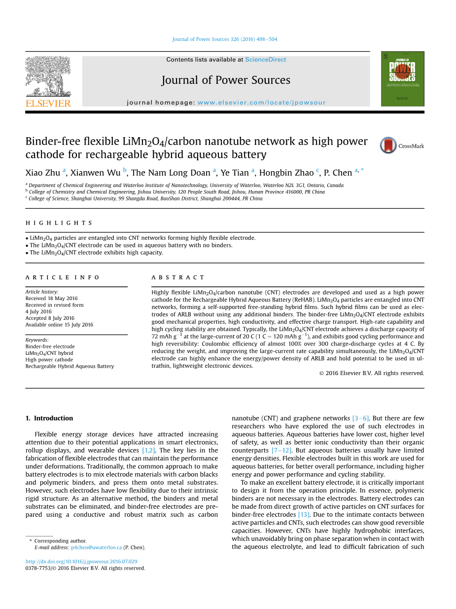 开发出高柔韧性的LiMn2O4/碳纳米管(CNT)电极,并用作可再充电混合水电池(ReHAB)的高功率阴极。LiMn2O4颗粒缠结到CNT网络中,形成自支撑的独立式混合膜。这种混合膜可以用作ARLB的电极而不使用任何额外的粘合剂。不含粘合剂的LiMn2O4/ CNT电极表现出良好的机械性能,高导电性和有效的电荷传输。获得高速率能力和高循环稳定性。通常,LiMn2O4/ CNT电极在20 C的大电流(1 C = 120 mAh g-1)下实现72 mAh g-1 的放电容量,并表现出良好的循环性能高可逆性:4℃300次充放电循环后的库仑效率接近100%。通过减轻重量,同时提高大电流倍率性能,LiMn2O4/ CNT电极可以大大提高ARLB的能量/功率密度和具有应用于超薄轻量级电子设备的潜力。