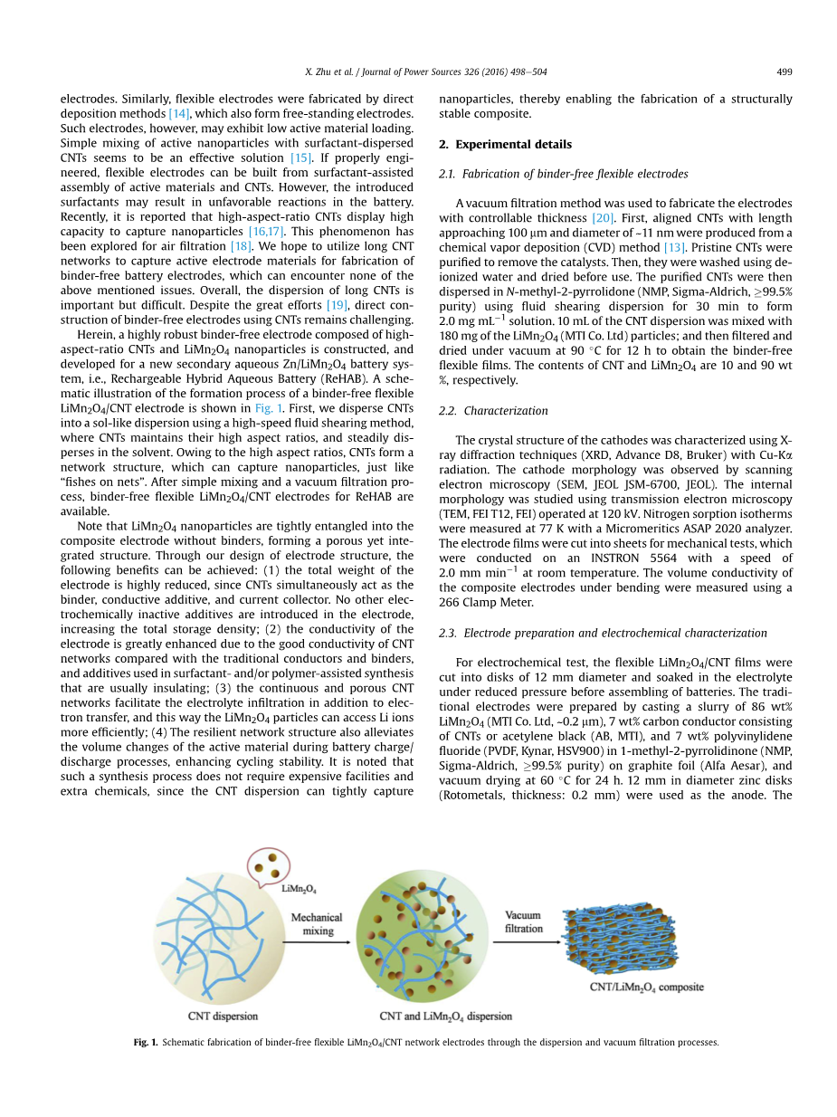 类似地,通过直接沉积方法制造柔性电极[14],也可以形成独立电极。然而,这种电极可能表现出低活性材料负载。活性纳米粒子与表面活性剂分散的CNT的简单混合似乎是有效的解决方案[15]。如果设计合理,可以通过表面活性剂辅助组装活性材料和碳纳米管来构建柔性电极。然而,引入的表面活性剂可能导致电池中的不利反应。最近,据报道,高纵横比CNT显示出高捕获纳米颗粒的能力[16,17]。这种性能已经被用于空气过滤[18]。我们希望利用长CNT网络来捕获活性电极材料以制造无粘合剂的电池电极,其不会遇到上述问题。总的来说,长CNT的分散很重要但很困难。尽管付出了巨大努力[19],使用CNT直接构建无粘合剂电极仍然具有挑战性。在此,构建了由高纵横比CNT和LiMn2O4 纳米颗粒组成的高度稳固的无粘合剂电极,并开发用于新的二级水性Zn / LiMn2O4 电池系统,即可充电混合水电池(ReHAB)。无粘结剂柔性LiMn2O4/ CNT电极形成过程的示意图如图。1所示。