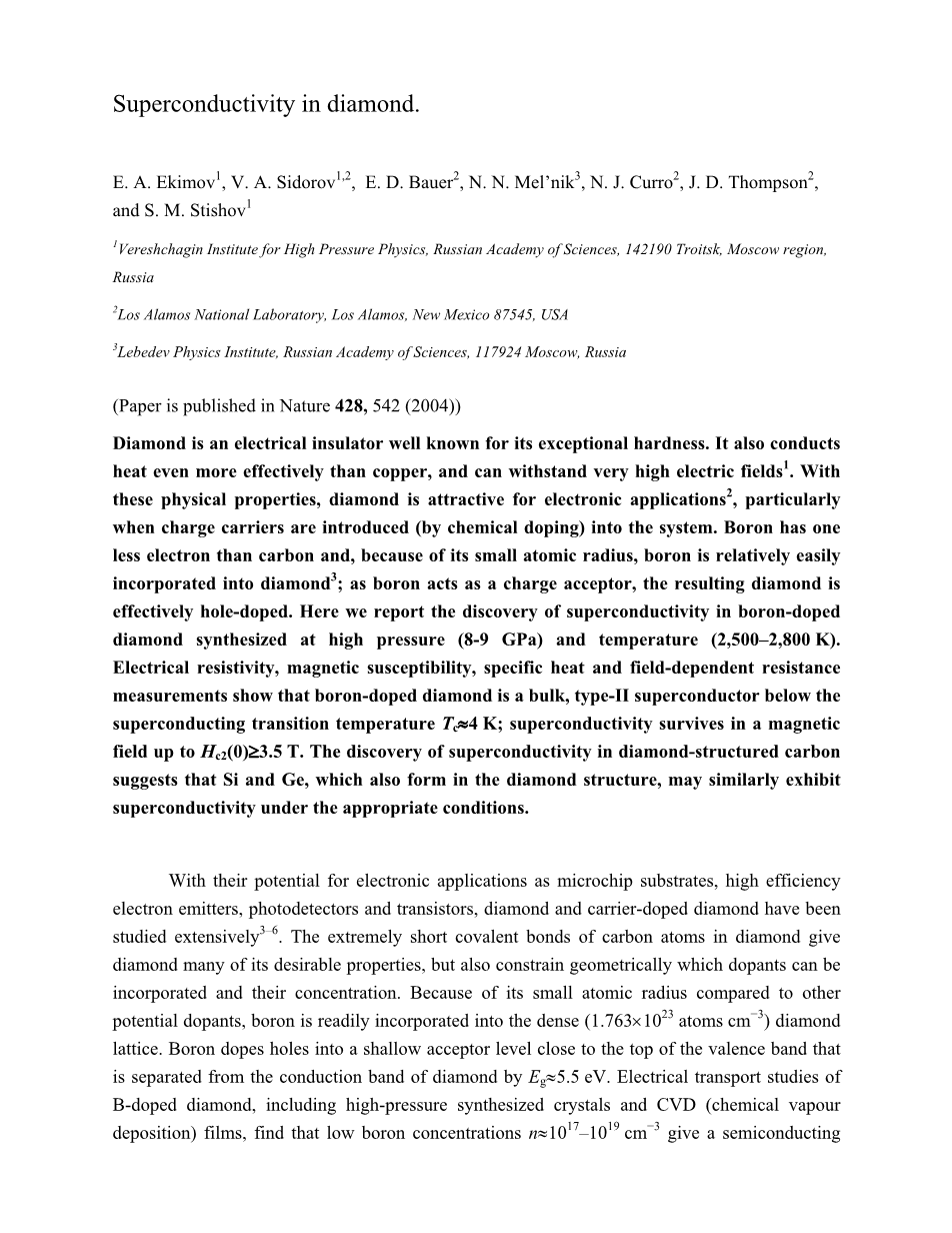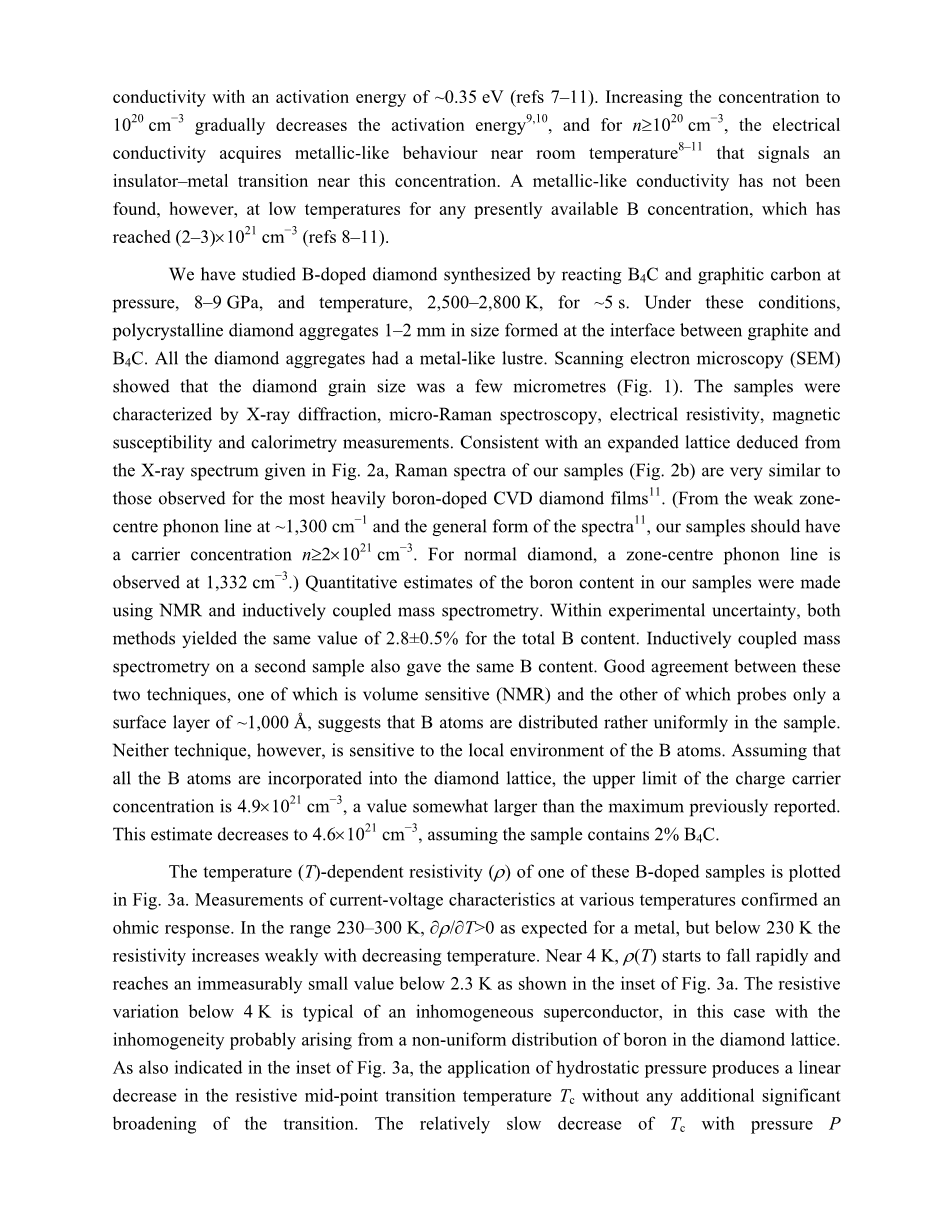金刚石是一种因卓越的硬度而闻名的电绝缘体。它能比铜更有效地传导热量,并且可以承受非常高的电场[1]。由于这些物理特性,金刚石在电子应用[2]方面具有很大潜力,特别是当电荷载体(通过化学掺杂)引入系统时。硼的电子比碳少一个,由于其原子半径小,硼相对容易掺入金刚石中[3];因为硼充当电荷受体,得到的金刚石实际上是空穴掺杂的。在这里,我们报告了在高压(8-9 GPa)和温度(2,500-2,800 K)下合成的掺硼金刚石的超导性。电阻率,磁化率,比热和场依赖电阻测量表明,掺硼金刚石是在超导转变温度Tcasymp;4K以下的块状II型超导体;超导电性在磁场高达Hc2(0)ge;3.5T中存在。金刚石结构碳中的超导性的发现表明,在金刚石的结构中也形成的Si和Ge在适当的条件下也可以类似地表现出具有超导性。