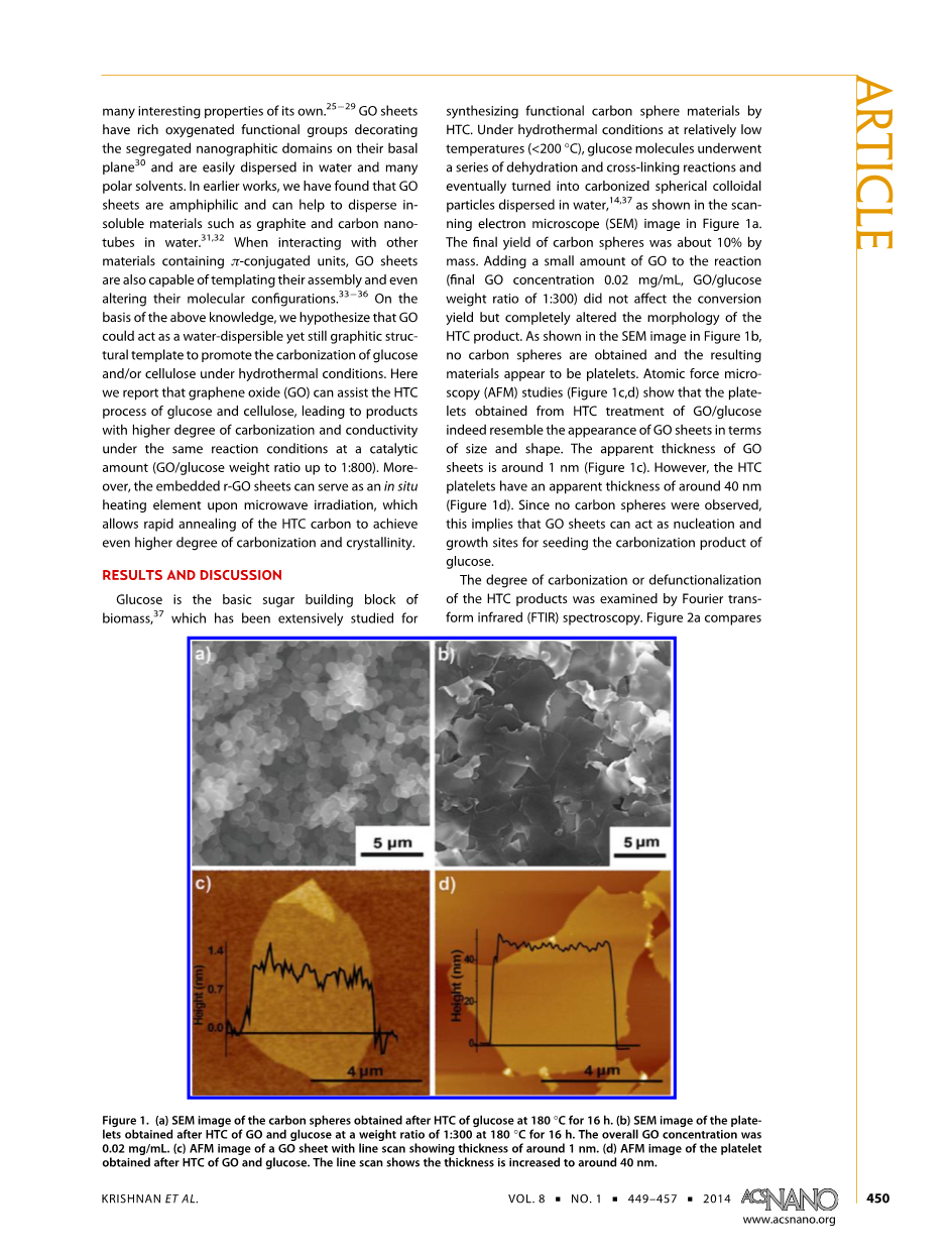 葡萄糖是生物量的基本糖组成部分,由HTC发现的一种合成功能碳球材料的方法得到了广泛的研究。在相对较低的水热条件下,葡萄糖分子经历了一系列脱水和交联反应,最终形成分散在水中的碳化球形胶体颗粒,如图1a扫描电镜(SEM)图像所示。碳球的最终产率约为质量的10%。加入少量的GO到反应中(最终氧化石墨烯浓度为0.02 mg/mL,氧化石墨烯/葡萄糖重量比为1:30 00)对转化率无影响,但完全改变了氧化石墨烯的形态的HTC产品。如图1b的SEM图像所示,没有得到碳球,得到的材料似乎是小板状物体。原子力显微镜(AFM)研究(图1c,d)表明,HTC处理氧化石墨烯/葡萄糖获得的血小板在大小和形状上确实与氧化石墨烯薄片的外观相似。氧化石墨烯薄片的表观厚度约为1nm(图1c)。然而,HTC血小板的表观厚度约为40纳米(图1 d)。由于没有观察到碳球,这意味着氧化石墨烯薄片可以作为葡萄糖碳化产物的成核和生长位点。采用傅里叶变换红外光谱(FTIR)对HTC产品的碳化或去功能化程度进行了研究。这证实了葡萄糖的脱水和芳香化HTC治疗。带子的中心在3400和1030厘米左右分别表示残余OH基团的拉伸模态和弯曲模态。与碳球的红外光谱非常相似。然而,相对强度的峰值在3400和1030厘米左右1显著降低。虽然水热处理的氧化石墨烯确实会产生更多的石墨化r-GO(图2a,虚线),但由于葡萄糖中只添加了0.3%的氧化石墨烯wt%,所以氧化石墨烯OH带强度的降低应归因于葡萄糖碳化程度的增强。上述HTC产品的热重分析(TGA)曲线如图2 b所示。它们的热降解特性有显著差异。葡萄糖源碳球的热降解主要经历两个减重阶段。在100摄氏度左右,第一次轻微的体重减轻约5%,这相当于去除水分和挥发性物质。另一个主要的减重效果几乎是额外的50%的wt %发生在200~750 ℃之间,这相当于有机化合物的裂解。从氧化石墨烯/葡萄糖中获得的血小板表现出更好的热稳定性,当加热到750摄氏度时,血小板的总重量仅减少了40%左右,这与相同温度范围下氧化石墨烯的最终重量降幅相当。在我们的HTC条件下,葡萄糖的碳化收率是左右的10 wt %。HTC处理后将GO转化为r-GO时,减重应该在50%左右。假设所有的氧化石墨烯薄片都变成了嵌在小板状物体中的r-GO, r-GO的含量应该在1.7%左右。图2b清楚的显示,加入少量的GO(及其r-GO产品)后,HTC产品的热稳定性大大提高,甚至可以与r-GO媲美。FTIR和TGA结果均表明,在HTC反应中加入氧化石墨烯可以使葡萄糖得到更高程度的碳化和石墨化。