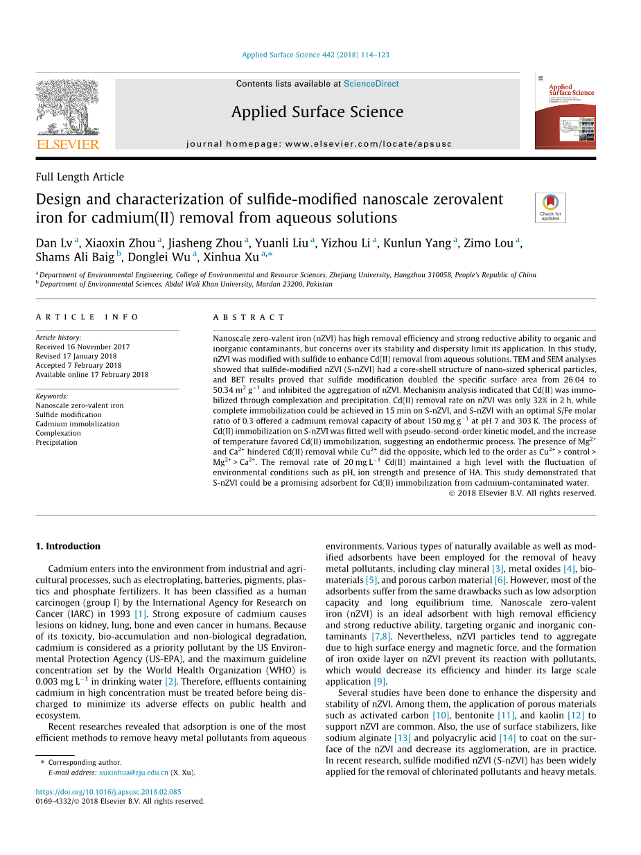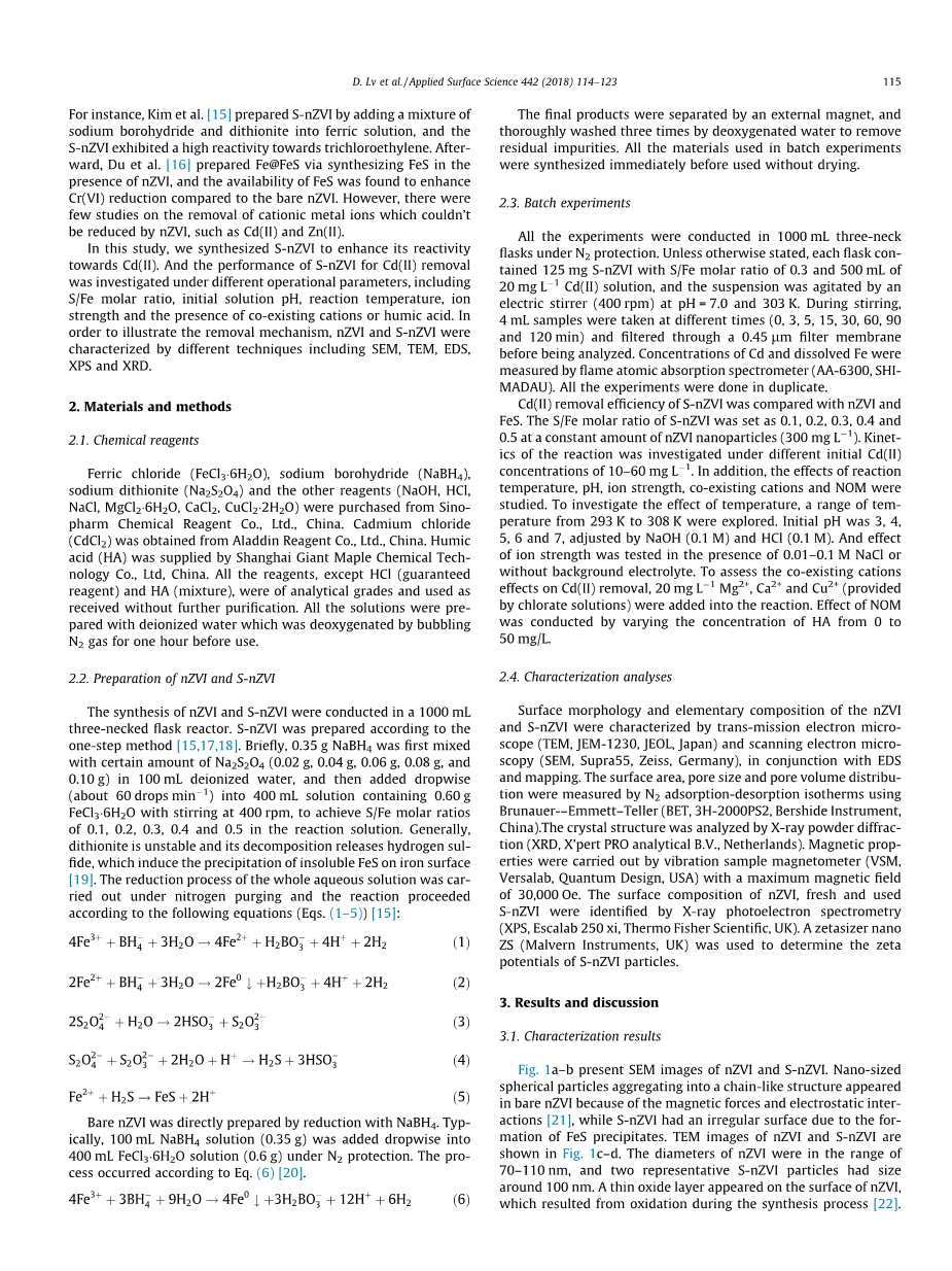 已经进行了几项增强nZVI的分散性和稳定性研究。 其中,多孔材料如活性炭[10],膨润土[11]和高岭土[12]用于支持nZVI是常见的。此外,在实践中,使用表面稳定剂,如海藻酸钠[13]和聚丙烯酸[14]涂在nZVI表面减少其团聚。在最近的研究中,硫化物改性的nZVI(S-nZVI)具有广泛应用于去除氯化污染物和重金属。例如,Kim等人 [15]通过向硼酸溶液中加入硼氢化钠和连二亚硫酸盐的混合物制备S-nZVI,并且S-nZVI表现出对三氯乙烯的高反应性。 之后,杜等人[16]通过在nZVI存在下合成FeS制备Fe @ FeS,并且发现与裸nZVI相比,FeS的可用性增强了Cr(VI)的减少。 然而,关于去除阳离子金属离子的研究很少,如Cd(II)和Zn(II)这种离子不能被nZVI还原。