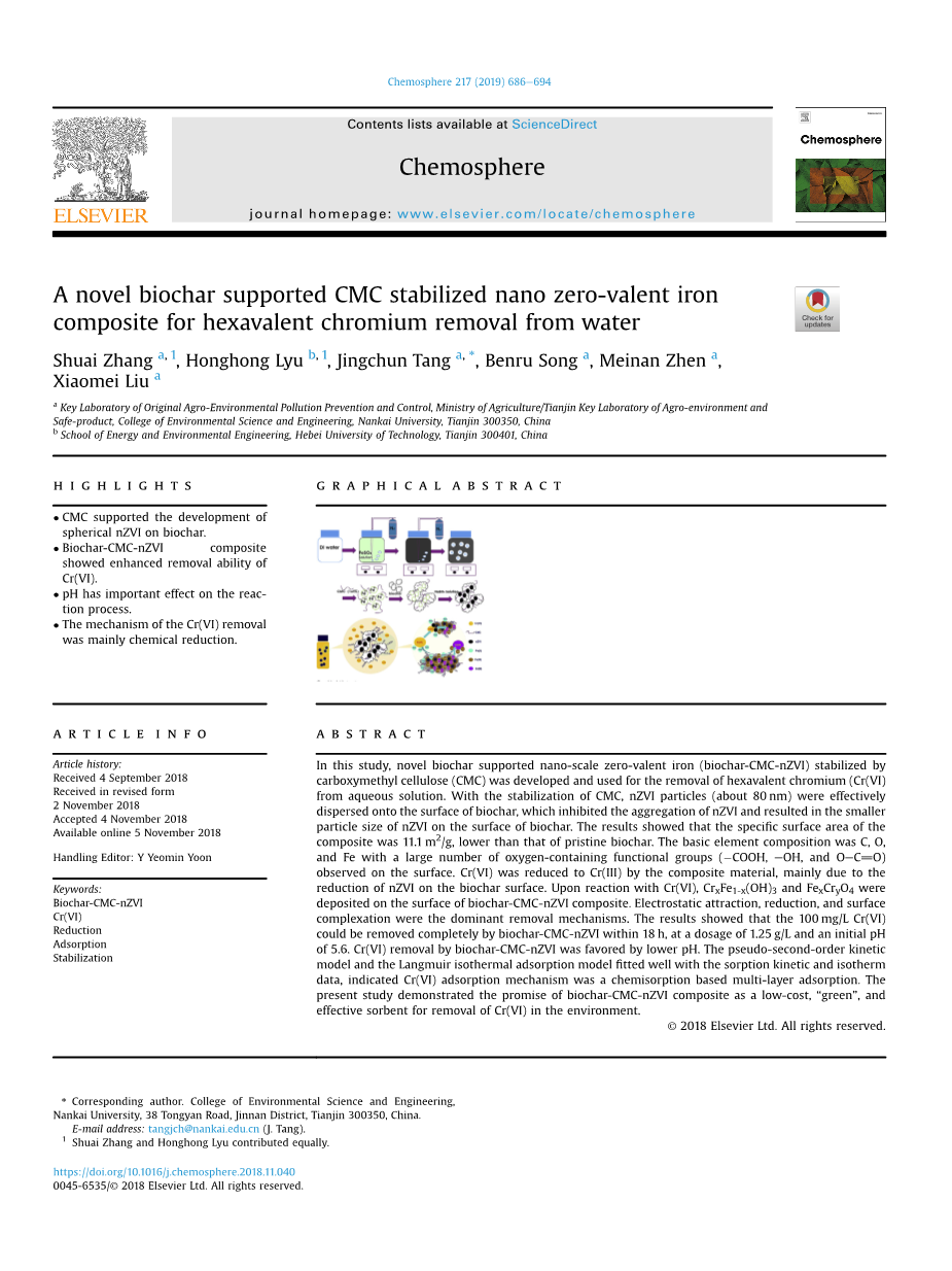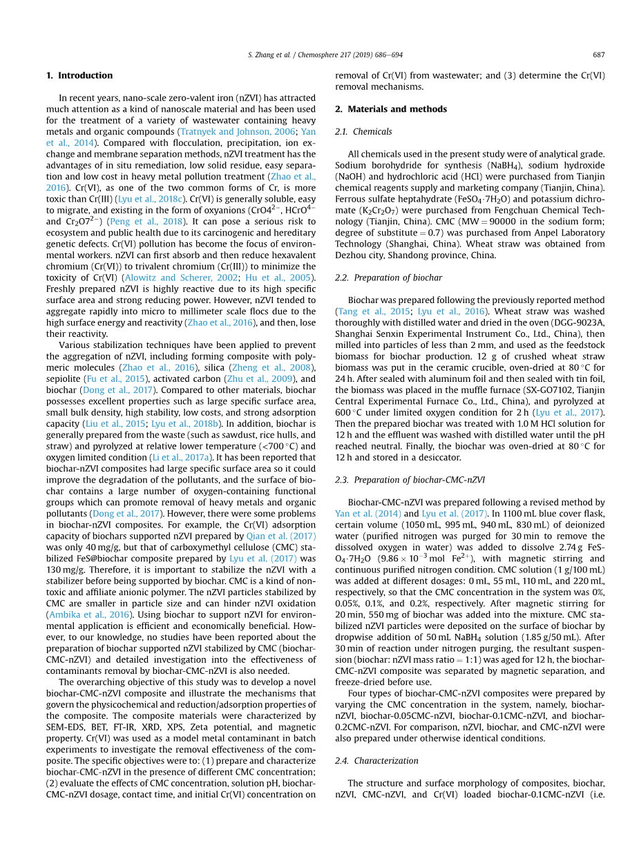 , 和 )。由于它的致癌性和导致遗传性遗传缺陷,对生态系统和公共健康构成严重风险。铬污染引起了环境工作者的重视。纳米零价铁可以先吸收Cr(VI),然后还原为Cr(III),以最大程度降低Cr(VI)的毒性。新鲜配置的纳米零价铁具有高活性,比表面积大和还原能力强。然而,由于表面能和反应性强,纳米零价铁倾向于迅速聚集为微米至毫米级的絮凝物,然后失去它的活性。现在已应用多种方式来防止纳米零价铁的集聚,包括与高分子,硅,海泡石,活性炭以及生物炭复合。相比于其他材料,生物炭具有许多优良的性能,比如说,比表面积大,容积密度小,稳定性强,廉价以及吸附容量大。生物炭通常由废弃物(例如锯末,稻壳和稻草)制成,并在相对较低的温度(lt;700℃)和氧气受限的条件下热解。有报道说生物炭复合纳米零价铁具有很高的比表面积,因此它可以改善污染物的降解,生物炭的表面含有大量的含氧官能团,可以促进重金属和有机污染物的去除。然而,生物炭复合纳米零价铁依旧具有许多问题。举个例子,Qian等人制备的生物炭复合纳米零价铁吸附Cr(VI)的能力仅为40mg/g,但是Lyu等人制备的羧甲基纤维素(CMC)稳定的FeS-biochar复合材料对Cr(VI)的吸附能力为130mg/g。因此,重要的是在与生物炭复合之前将纳米零价铁稳定住。CMC是一种无毒的缔合阴离子聚合物。经CMC稳定的纳米零价铁颗粒粒径较小,可阻碍纳米零价铁氧化。使用生物炭复合纳米零价铁在环境中的应用是高效且经济上有利的。然而,据我们所知,尚未有关于通过CMC(biochar-CMC-nZVI)稳定化的生物炭负载的纳米零价铁的制备的研究的报道,也没有对用biochar-CMC-nZVI去除污染物的有效性进行详细研究的报道。