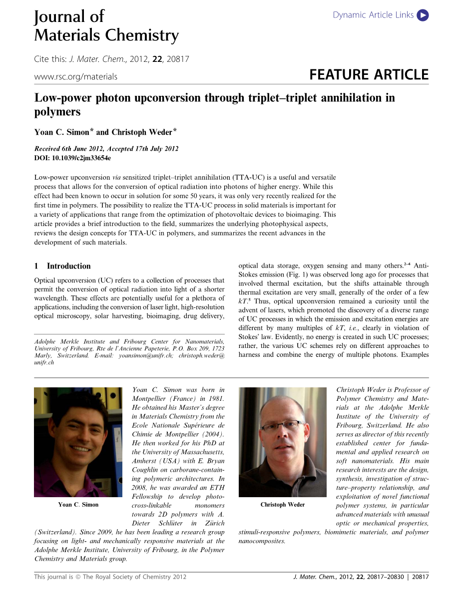 Yoan C. Simon于1981年出生于蒙彼利埃(法国)。他从国立高等获得了材料化学硕士学位。 化学公司蒙彼利埃(2004)。 然后,他在马萨诸塞大学,美国阿默斯特大学获得博士学位,并在布莱恩·考夫林就含碳硼聚合物结构工作。 2008年,他与A. Dieter Schluter在Zeuro;urich(瑞士)以开发光交联单体向2D聚合物被授予ETH奖学金。 自2009年以来,他一直领导一个研究小组,在弗里堡大学的阿道夫·梅克尔研究所的聚合物化学和材料小组,专注于光和机械响应材料的研究。