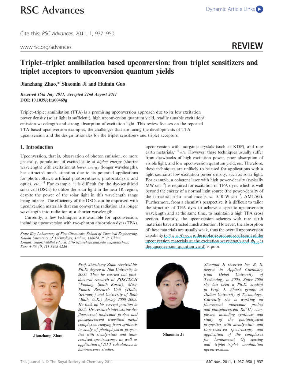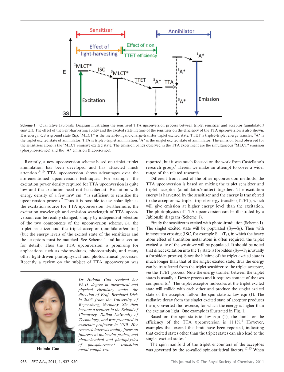 这条线是含有有机荧光的2,4,5,7-四碘-6-羟基3-荧光酮(TIHF),作为基于TTA上转换的三重态敏化剂(图22)。48染料显示出较低的荧光量子产率(Phi;F)的0.13,但较高的量子产率存在激发三重态(Phi;T= 0.87)。49在这种情况下,在实验的三重激发态的量子产率Phi;T= 1-Phi;F证明。应该指出的三重激发态的量子产率不一定总是Phi;T= 1-Phi;F。