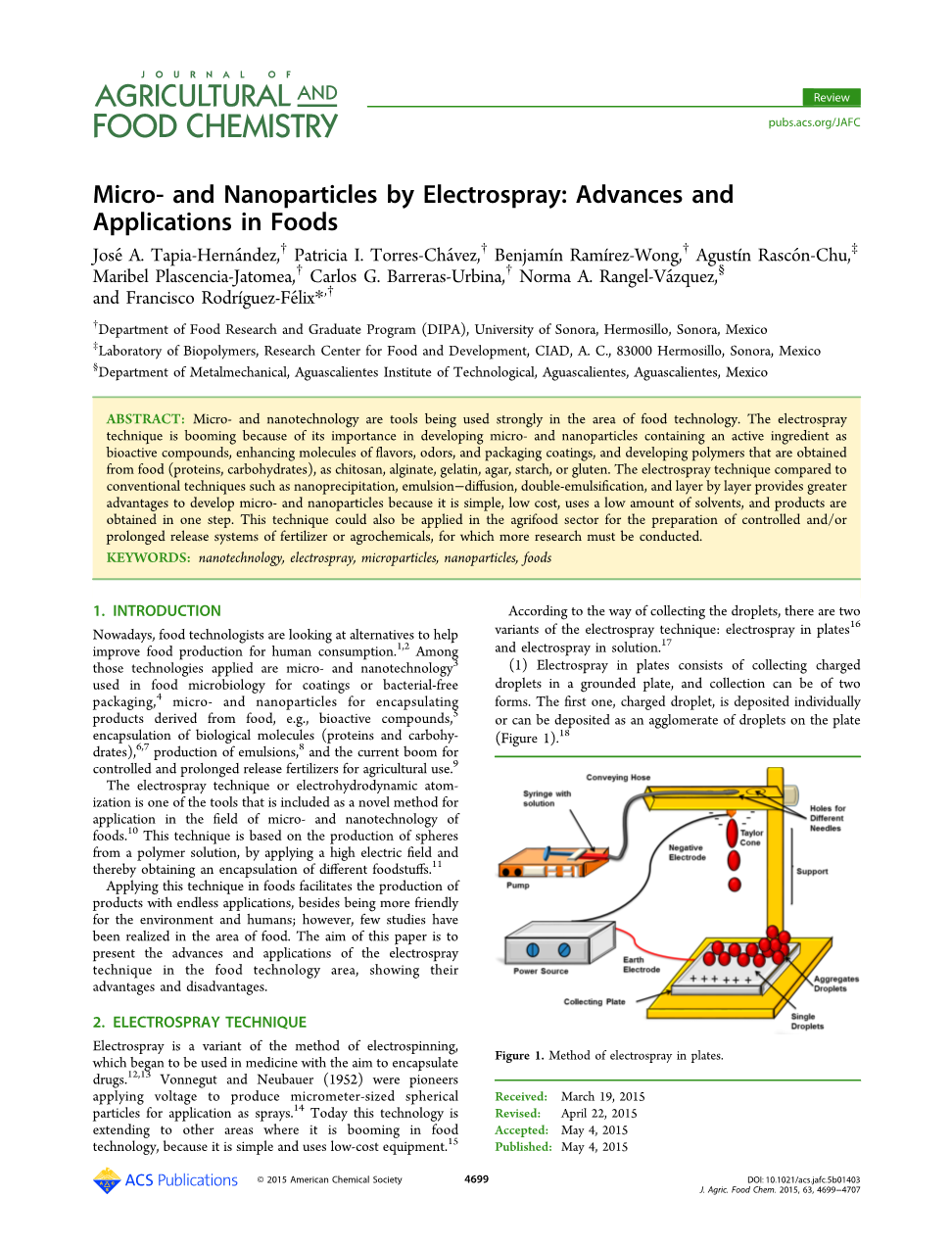 微米和纳米技术是在食品技术领域被广泛使用的工具。电喷雾技术蓬勃发展,因为其重要性在于开发含有活性成分的微生物和纳米颗粒作为生物活性化合物,增强分子的气味,气味和包装涂料,以及开发由食品(蛋白质,碳水化合物)获得的聚合物作为壳聚糖,藻酸盐,明胶,琼脂,淀粉或麸质。与常规技术相比,电喷雾技术如纳米沉淀法,乳液法,双重乳化法和逐层提供更大的优点,因为其简单,成本低,使用少量溶剂,因此开发微米和纳米颗粒具有更大的优势,产品是 在一个步骤中获得。这种技术也可以应用于农产品部门,用于制备化肥或农药的受控和/或延长释放系统,为此必须进行更多的研究。