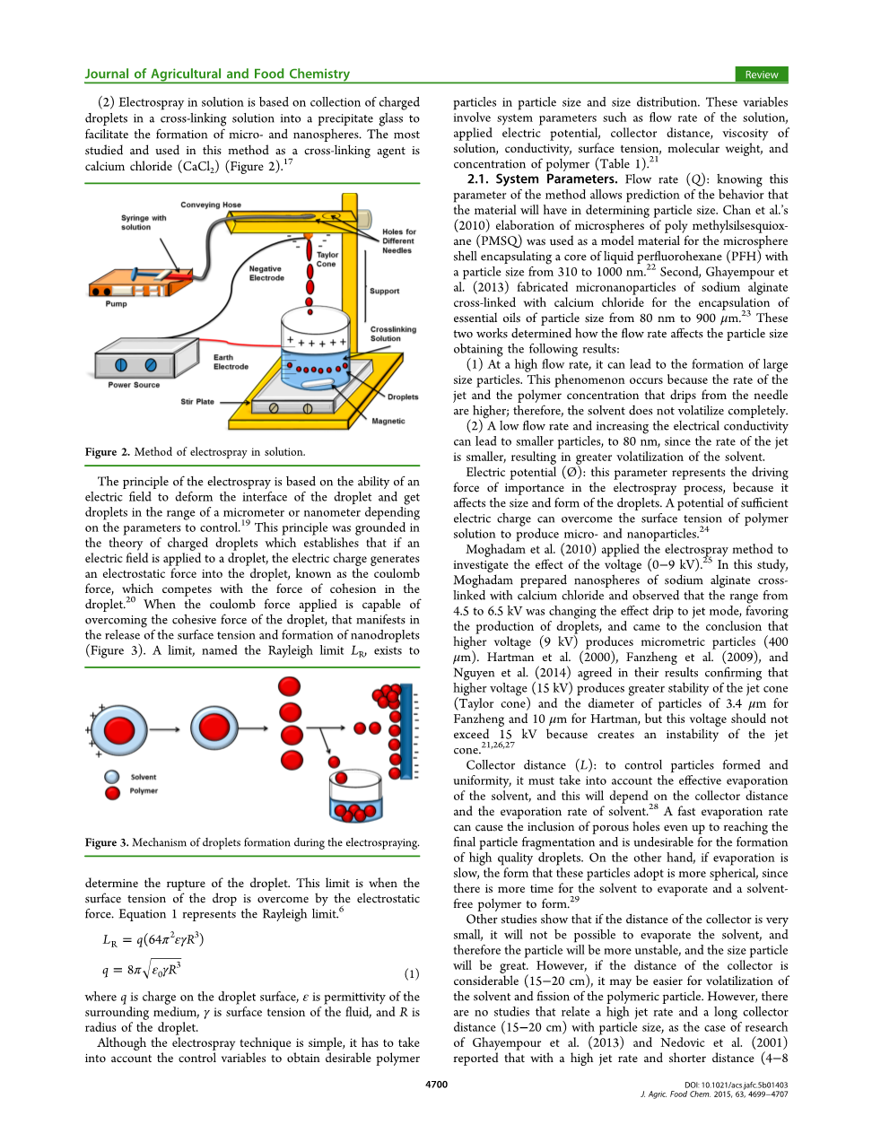 Moghadam等人(2010)应用电喷雾法来研究电压(0-9 kV)的效果。在这项研究中,Sa制备了与氯化钙交联的海藻酸钠纳米球,并观察到4.5至6.5kV正在将效果改变为喷射模式,有利于产生液滴,并得出更高的电压(9kV)产生微米颗粒(400mu;m)的结论。Hartman等人(2000),Fanzheng(2009)和Nguyen等人(2014年)同意其结果,确定更高的电压(15 kv)可以产生更大的喷射锥(泰勒锥)的稳定性,而Fanzheng的颗粒直径为3.4mu;m,Hartman为10mu;m,但该电压不应超过15 kV 因为造成喷气锥体的不稳定性。