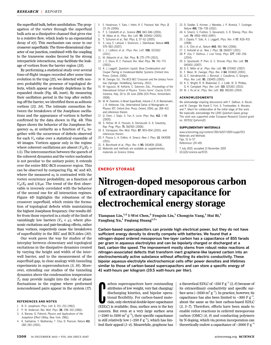 碳基超级电容器可以提供高的电功率,但是它们并没有高的能量密度去直接和电池进行竞争。我们发现了一种氮掺杂的有序的层状介孔碳在水系电解液中具有855 F/g的电容量,并且可以一种快速的、类似碳的速度进行双极的充电和放电。这种提升很大程度上是由于与掺杂氮相关的缺陷产生的强烈的氧化还原反应,这种与掺杂氮相关的缺陷把惰性的石墨烯状层状碳转变为一种具有电化学活性的物质,而不影响到它的电导率。这种双极的使用水系电解液的电化学电池可以提供与碳基超级电容器相似的功率密度和使用寿命,并且它可以存储的比能量为41瓦时每千克(19.5瓦时每升)。