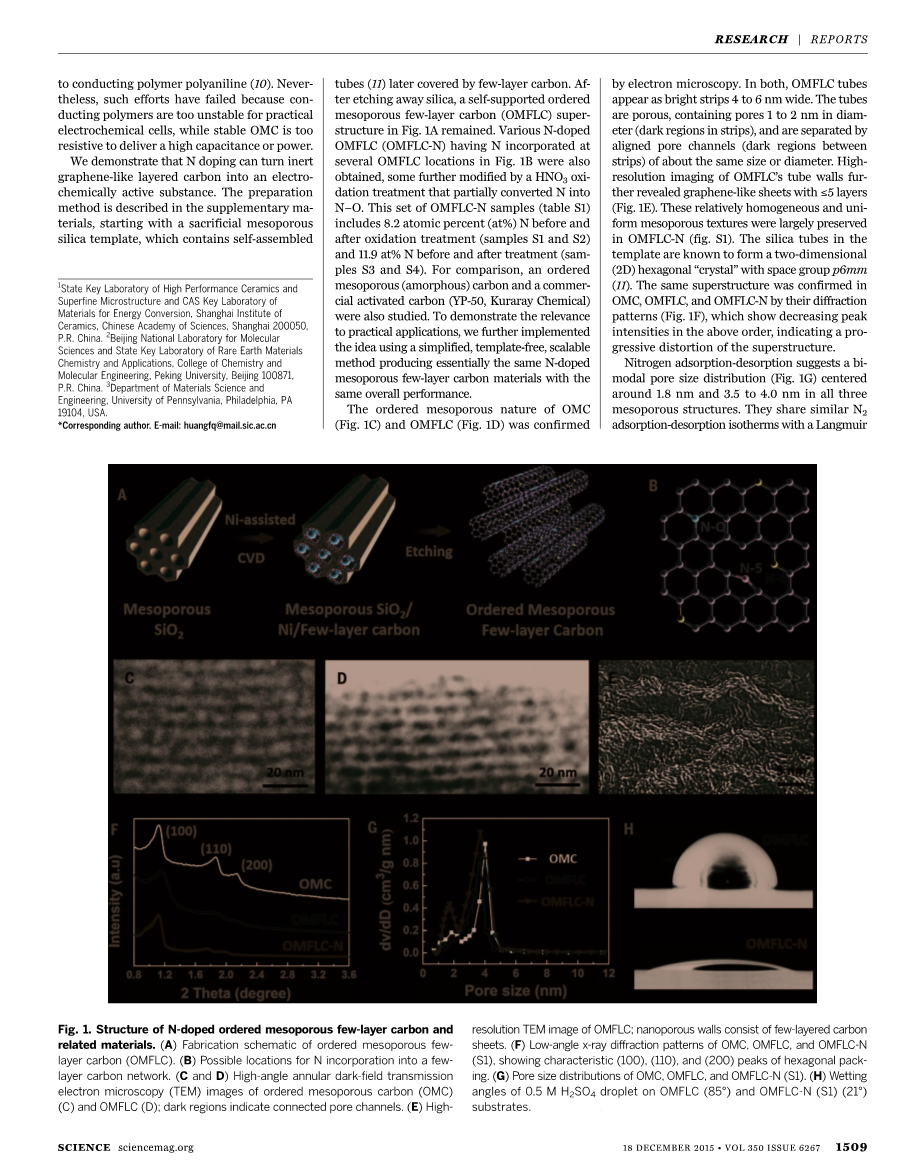 我们提出氮掺杂可以把惰性的石墨烯状层状碳转变为一种具有电化学活性的物质。制备方法在补充材料中进行了描述,首先从牺牲介孔的二氧化硅模板开始,它包括了自组装的管子(11),其后来被几层的碳覆盖。之后蚀刻掉二氧化硅,一种图1A中的自我支撑的有序介孔层状碳(OMFLC)超级结构留下了。多种N掺杂的OMFLC(OMFLC-N),即在几个OMFLC位置处纳入N在图1B中也得到了,还有一些通过HNO3氧化处理进一步改性,将部分N转化为N-O。这组OMFLC-N样本(表S1)包含了8.2原子百分比(at%)的N在氧化处理前和后(样品S1和S2),以及11.9 at%的N在处理前和处理后(样本S3和S4)。为了比较,也对一种有序的介孔(无定形)碳和一种商业的活性炭(YP-50,Kuraray Chemical)进行了研究。为了展示与实际应用的相关性,我们进一步使用简化的,无模板的,可扩展的方法生产了基本上相同的并且具有相同的整体表现的N掺杂介孔层状碳材料。