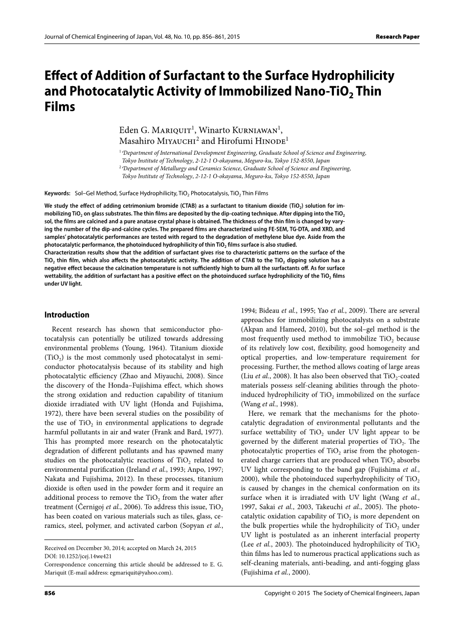 许多研究报告了使用烷基磷酸酯、十二烷基胺等离子表面活性剂和其他商用离子表面活性剂(1999年;Yoshi-Sake等人,2002年;Mohamed等人,2008年)制备二氧化钛薄膜的研究; 然而,很少有人将十六烷基三甲基溴化铵(CTAB)作为表面活性剂用于制备二氧化钛薄膜,以及十六烷基三甲基溴化铵对二氧化钛薄膜的光催化活性和光致亲水性的影响。