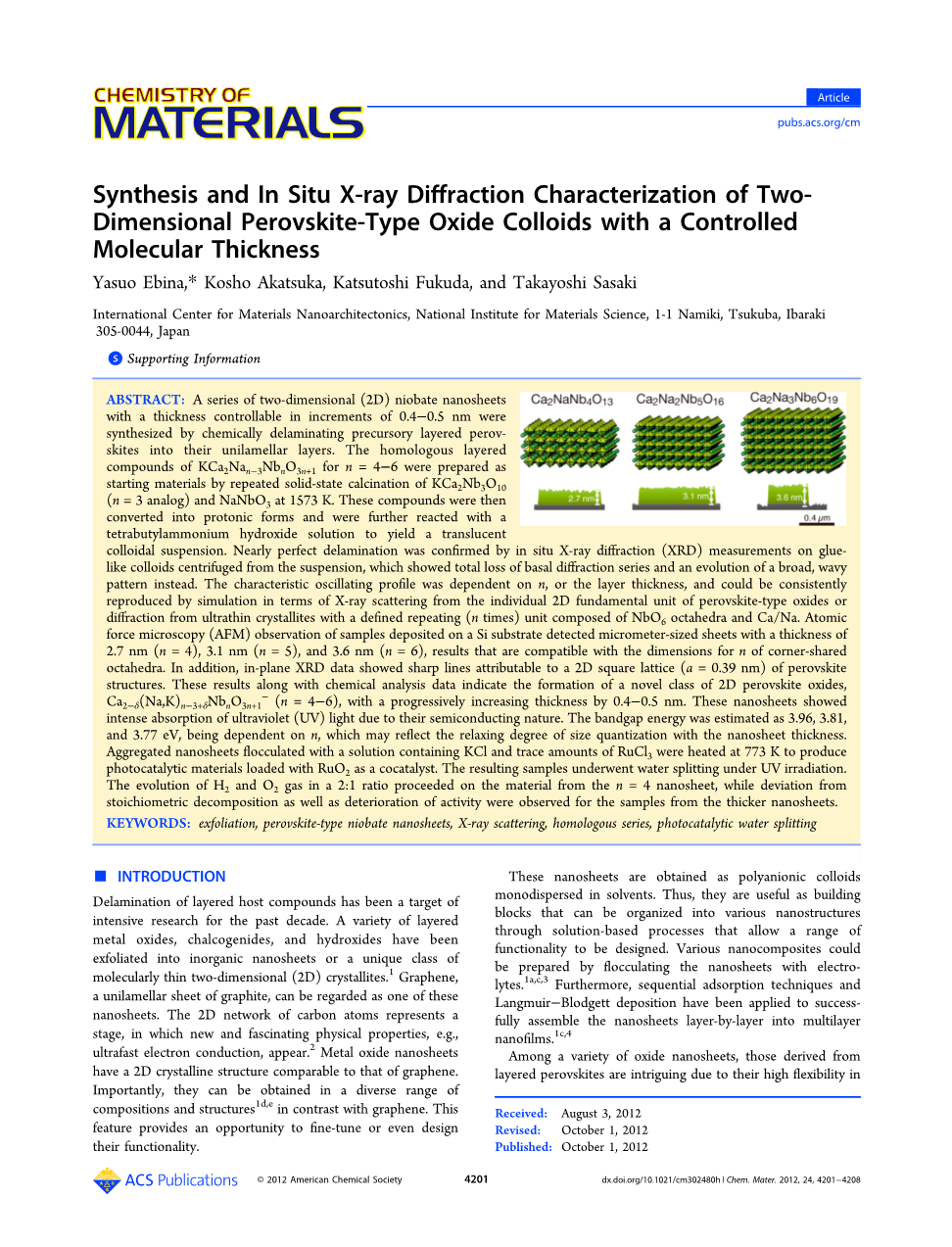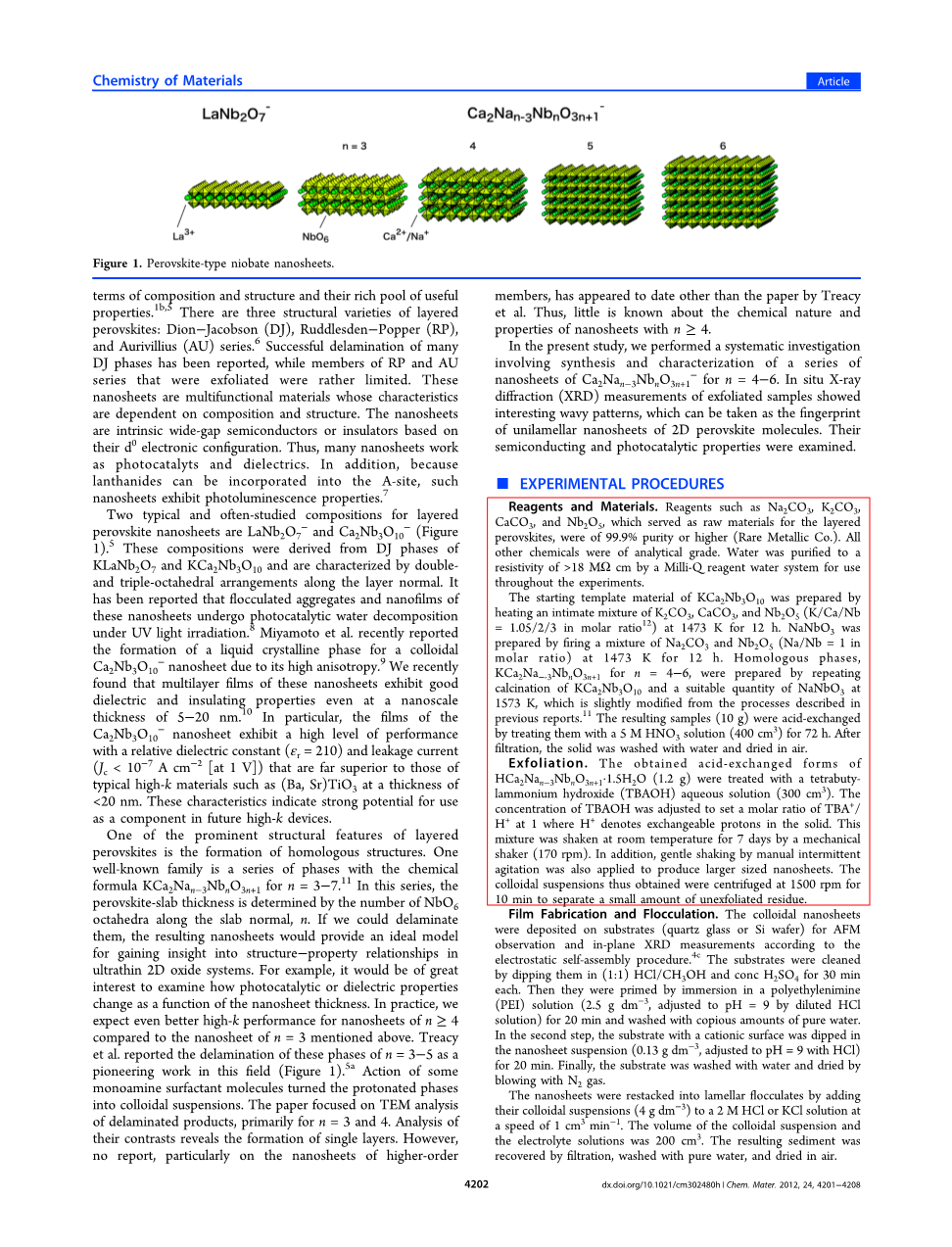 可形成同源结构是分层钙钛矿的突出结构特征之一。化学式KCa2Nan-3NbnO3n 1(n = 3-7)的一系列相都很常见。11在该系列中,钙钛矿板厚度由沿板坯法线n的NbO6八面体的数量决定。如果我们可以将它们分层,那么得到的纳米片将为理解超薄二维氧化物体系中的结构与性质的关联提供理想的模型。比如,我们可以研究光催化或介电性能如何随纳米片的厚度而变化。事实上,我们预测nge;4的纳米片与上述n = 3的纳米片相比具有更好的介电性能。 Treacy等人报道了n = 3-5这些相的分层作为该领域的开拓性工作(图1)5a一些单胺表面活性剂分子的作用将质子化相转变为胶体悬浮液。本文主要集中针对n = 3和4的分层产品的TEM分析。它们的对比分析证明了单层的形成。然而,除了Treacy等人的论文外,没有任何报道,特别是关于更高层的纳米片。因此,我们对nge;4的纳米片的化学性质了解非常少。