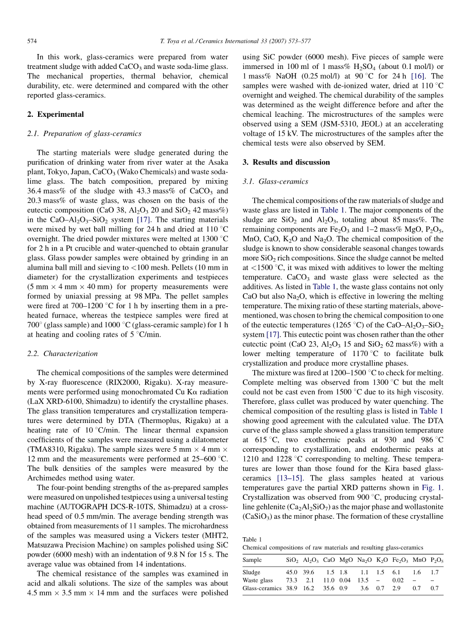 将混合物在1200-1500℃范围内灼烧使其熔化以方便检测。从1300℃下观察到完全熔化,但由于其拥有很高的粘度,熔体不能在1500℃下熔化。因此,玻璃碎块必须通过水淬法来制备。在表1中列出了所得玻璃的化学组成,其与计算值很好地一致。在玻璃样品的DTA曲线中显示,在615℃下的玻璃化转变温度,930和986℃处的两个放热峰对应于结晶,并且在1210和1228℃处的吸热峰对应于熔化。这些温度比基拉玻璃陶瓷的所对应的温度要低[13-15]。与此同时,在不同温度下加热的玻璃样品产生了如图1所示的部分XRD图谱。从900℃观察到有结晶产生,结晶产生了作为主相的晶体线型钙长石(Ca2Al2SiO7)和作为次要相的硅灰石(CaSiO3)。当然,这些晶相的形成被认为是对应于DTA曲线在两个放热峰导致的。结晶相的量增加至1000℃下就停止了,在此温度(1000℃)以上结晶相的量逐渐降低。所得玻璃碎片的结晶被发现涉及到表面结晶而非整体结晶,即使玻璃含有大量的杂质成分并将组合物分级为富含改性剂。因此,必须使用成核剂(化学组成成分例如TiO2,ZrO2,FeS)来引起结晶来使结晶相产生[18]。
