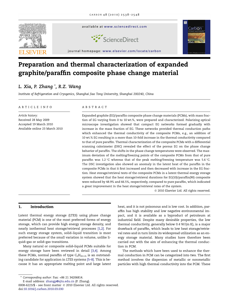 许多适合于储能的天然或复合固液PCM已经被详细评论[3,4]。在这些PCM中,C n H 2n 2型正构烷烃是LTES系统应用的杰出候选者[5-8]。 这是因为它具有合适的熔点和较大的潜热,并且无毒并且成本低。另外,石蜡具有较高的稳定性和较低的环境负面影响,作为工业领域的石油副产品可被获得。 尽管具有许多理想的性能,但低导热率(通常低于0.4W /(m K))是石蜡的主要缺点,这导致低的储热/回收率并且因此限制了其作为储能材料的广泛利用。 因此,为了增强PCM中的热传导,已经进行了许多研究。