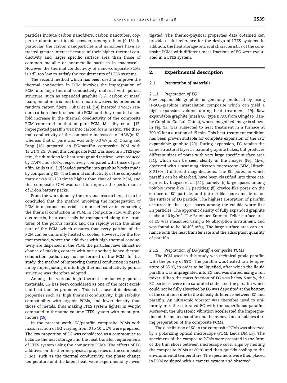 在各种高导热性多孔材料中,EG被认为是最优异的传热促进剂之一。 这是因为它具有理想的性能,例如:高导热性,高稳定性,与有机相变材料的兼容性以及比金属材料更低的密度,因此使LTES系统的重量轻于与金属促进剂相同体积的LTES系统[18]。