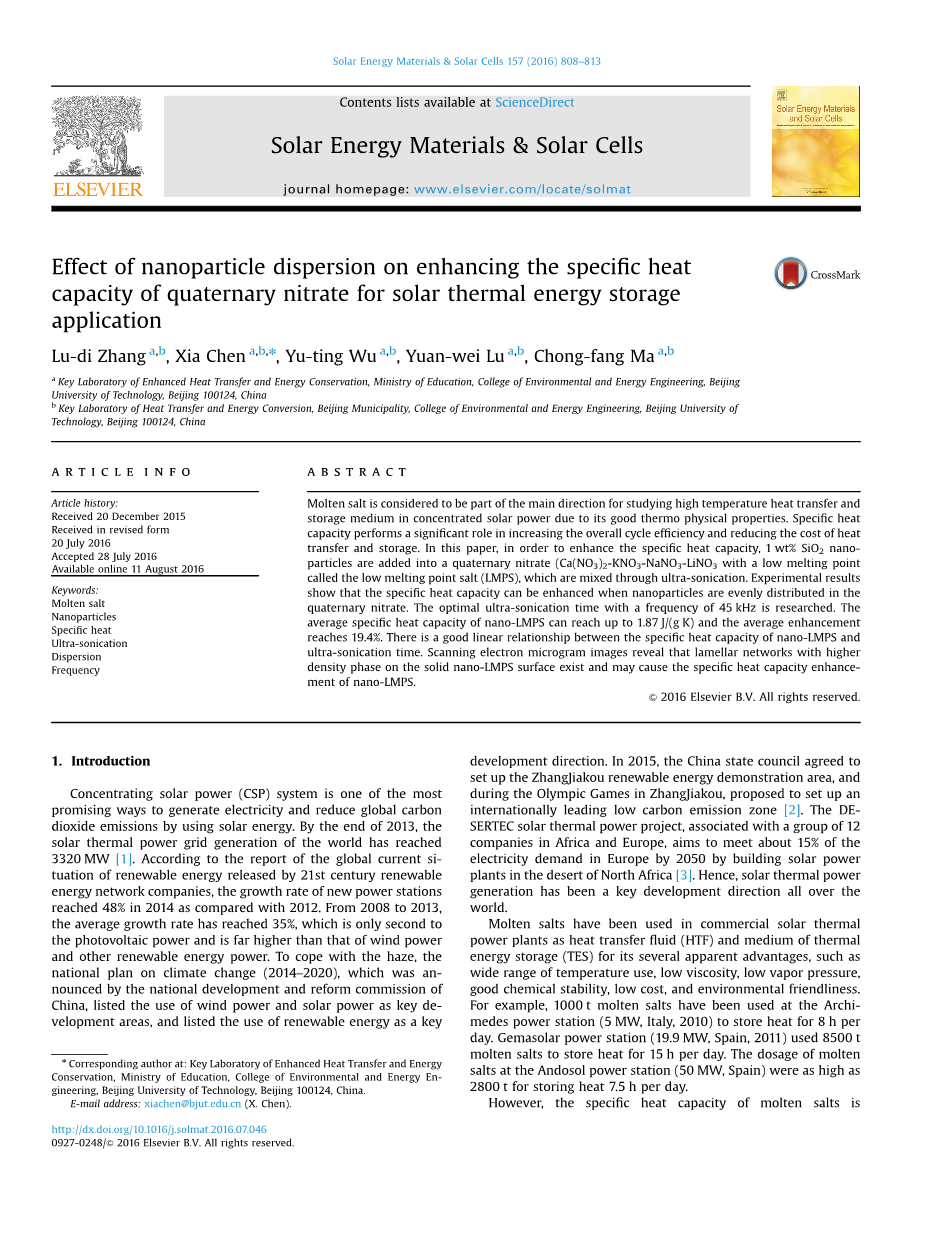 纳米粒子分散对提高太阳能热储能材料-四元硝酸盐比热容的影响
